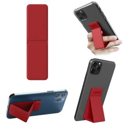 Tizum Universal Foldable Handheld Mobile Holder Kickstand, Horizontal Or Vertical Phone Stand Hand, Finger Grip, Magnetic Suction Folding Bracket Leather Finish Tabletop (Red)