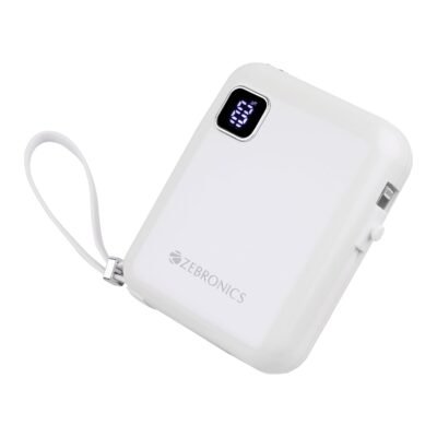ZEBRONICS MW64 Compact Power Bank, 10000 mAh, Rapid Charge, 22.5W Output, Outputs – Type C Cable | Type C Port | Lightning Port, Percentage Indicator, Made in India (White)
