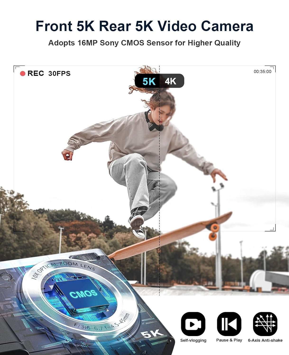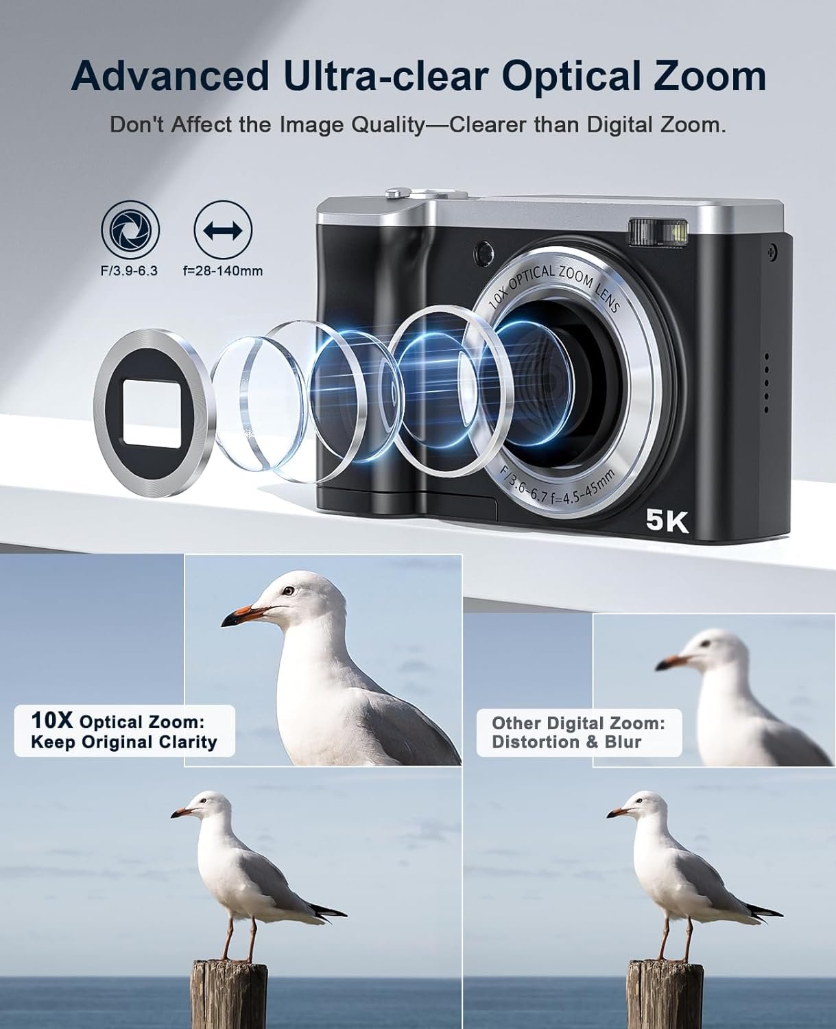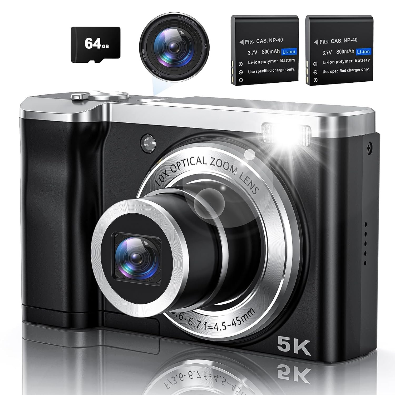 Special feature: 5K Digital Camera with 64G Micro Card 10X Optical Zoom, 56MP Touch Screen Selfie Camera with Front and Rear Lens, Vlogging Cameras for Photography and Video