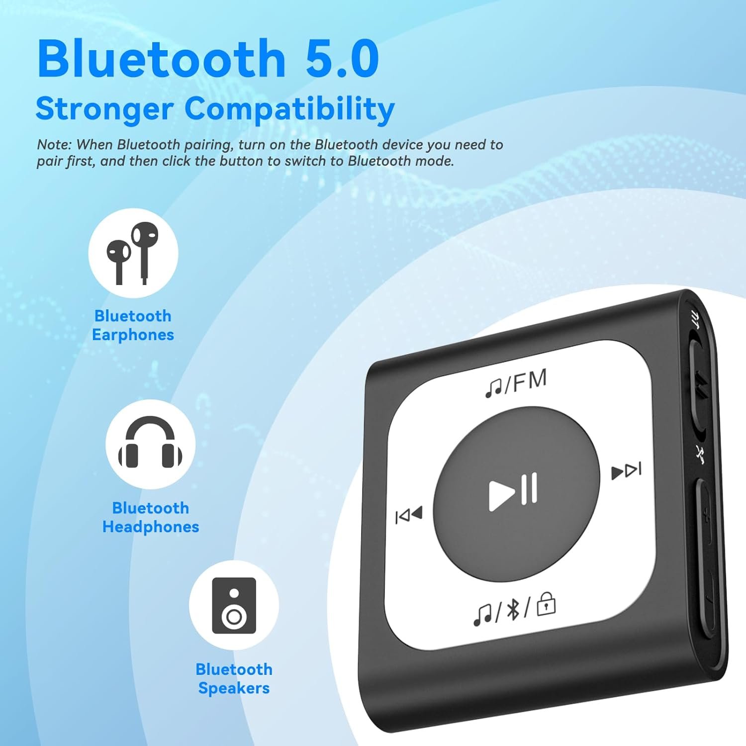 WIRELESS BLUETOOTH 5.0 – AGPTEK MP3 player adopts upgraded Bluetooth 5.0 has better compatibility, stable signal and reduces the power consumption of the music player. Just turn on the Bluetooth device to be paired, and then click the Bluetooth button to pair.