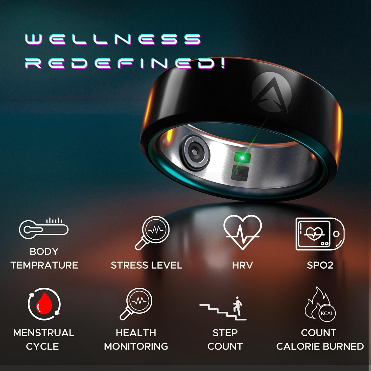 [𝐂𝐎𝐌𝐏𝐑𝐄𝐇𝐄𝐍𝐒𝐈𝐕𝐄 𝐇𝐄𝐀𝐋𝐓𝐇 𝐌𝐎𝐍𝐈𝐓𝐎𝐑𝐈𝐍𝐆] : Equipped with a state-of-the-art SpO2 sensor, this wearable tech ring provides real-time blood oxygen level monitoring, offering crucial insights into your respiratory health. The continuous heart rate monitoring feature uses a precise heart rate sensor to keep track of your cardiovascular health, with customizable alerts to notify you of any irregularities. Additionally, the smart ring provides detailed analysis of your sleep patterns, including REM, light.