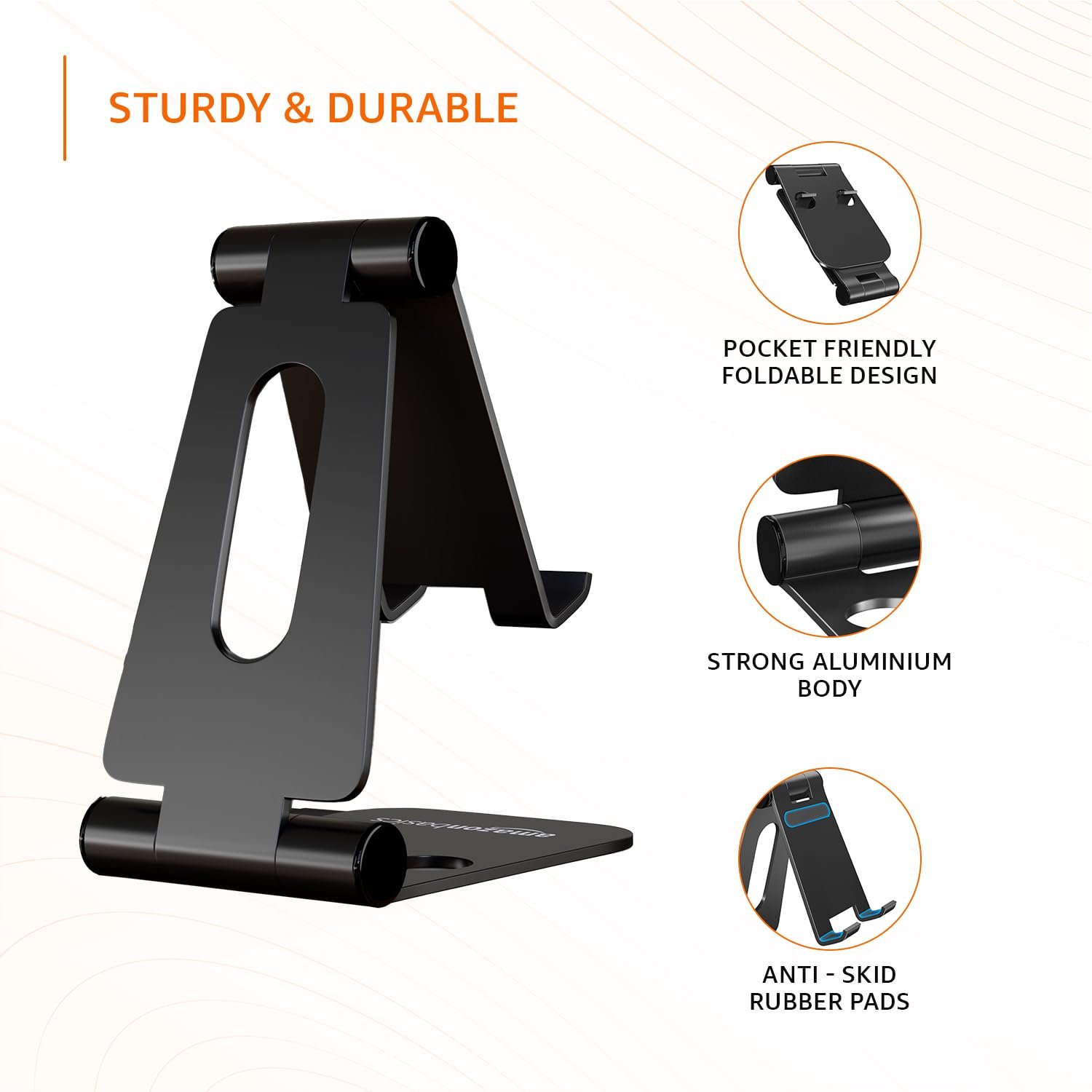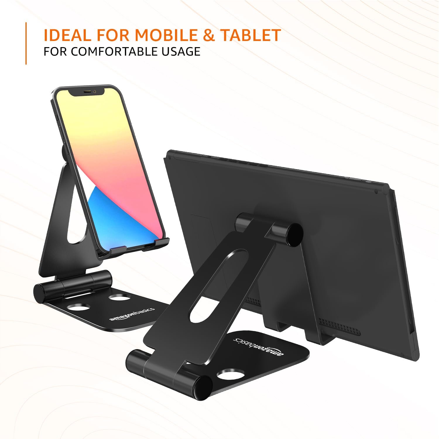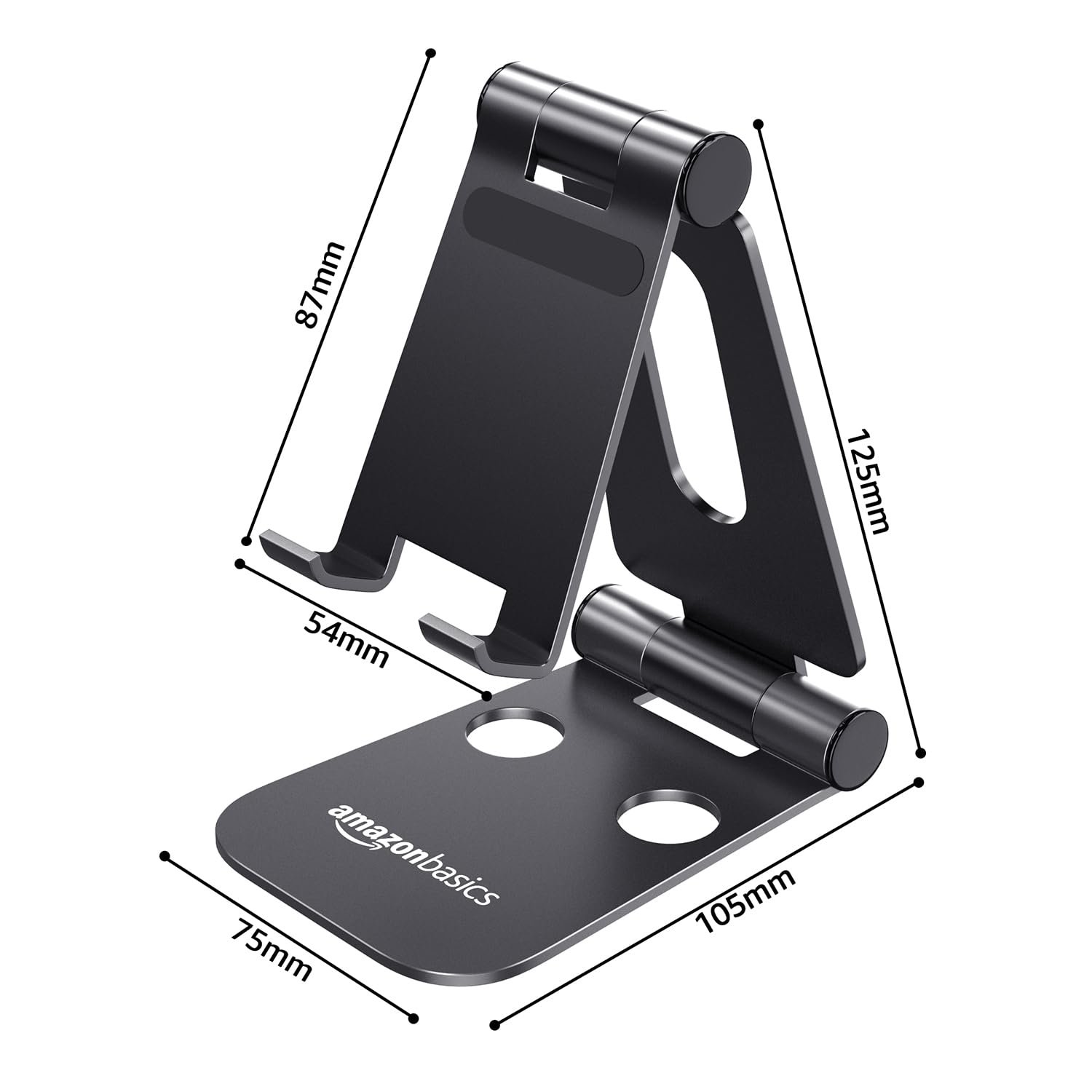 amazon basics Aluminum Adjustable Mobile Phone Foldable Tabletop Stand Dock Mount for All Smartphones, Tabs, Kindle, iPad (Black)