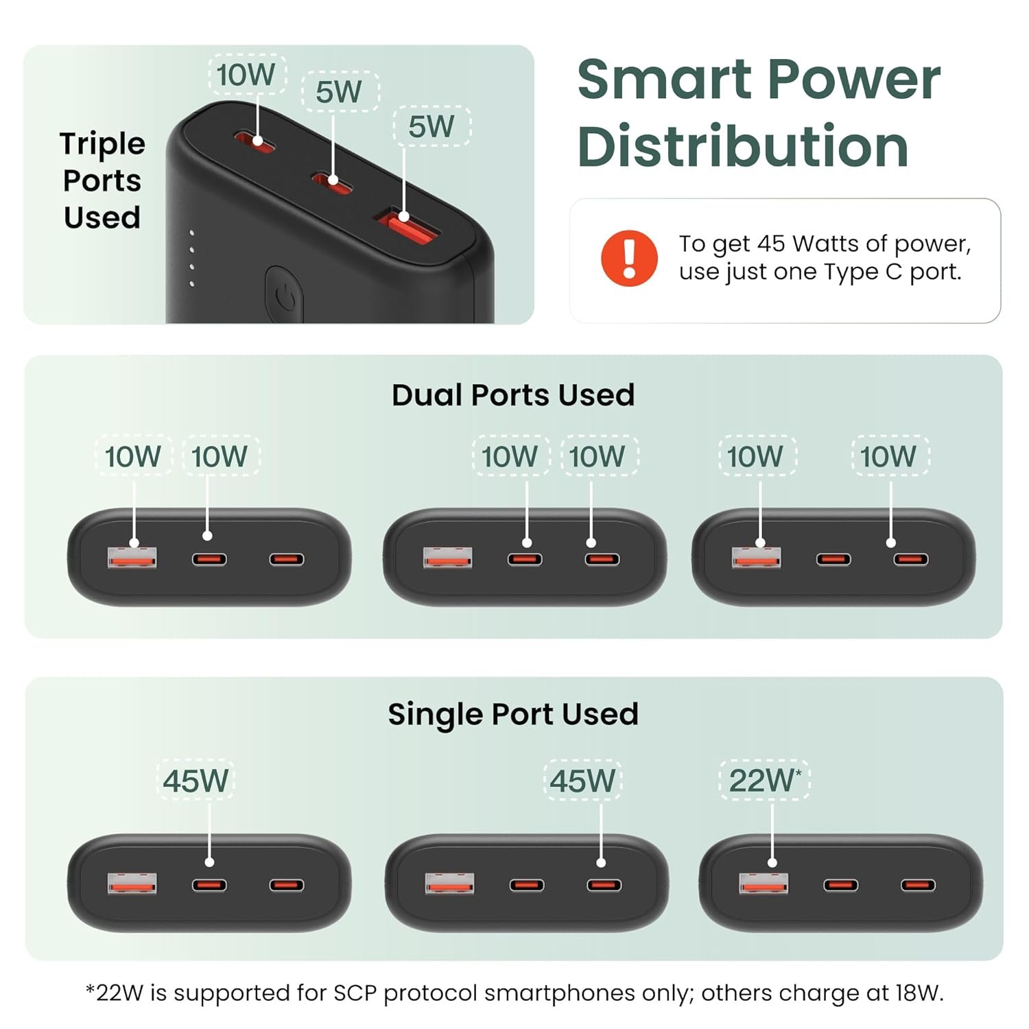 Triple Output Ports for Multi-Device Charging: With its 1 USB-A and 2 Type-C ports, this power bank supports simultaneous charging of multiple devices. Whether you need a powerbank for iPhone or a laptop power bank, it accommodates diverse charging needs effortlessly.