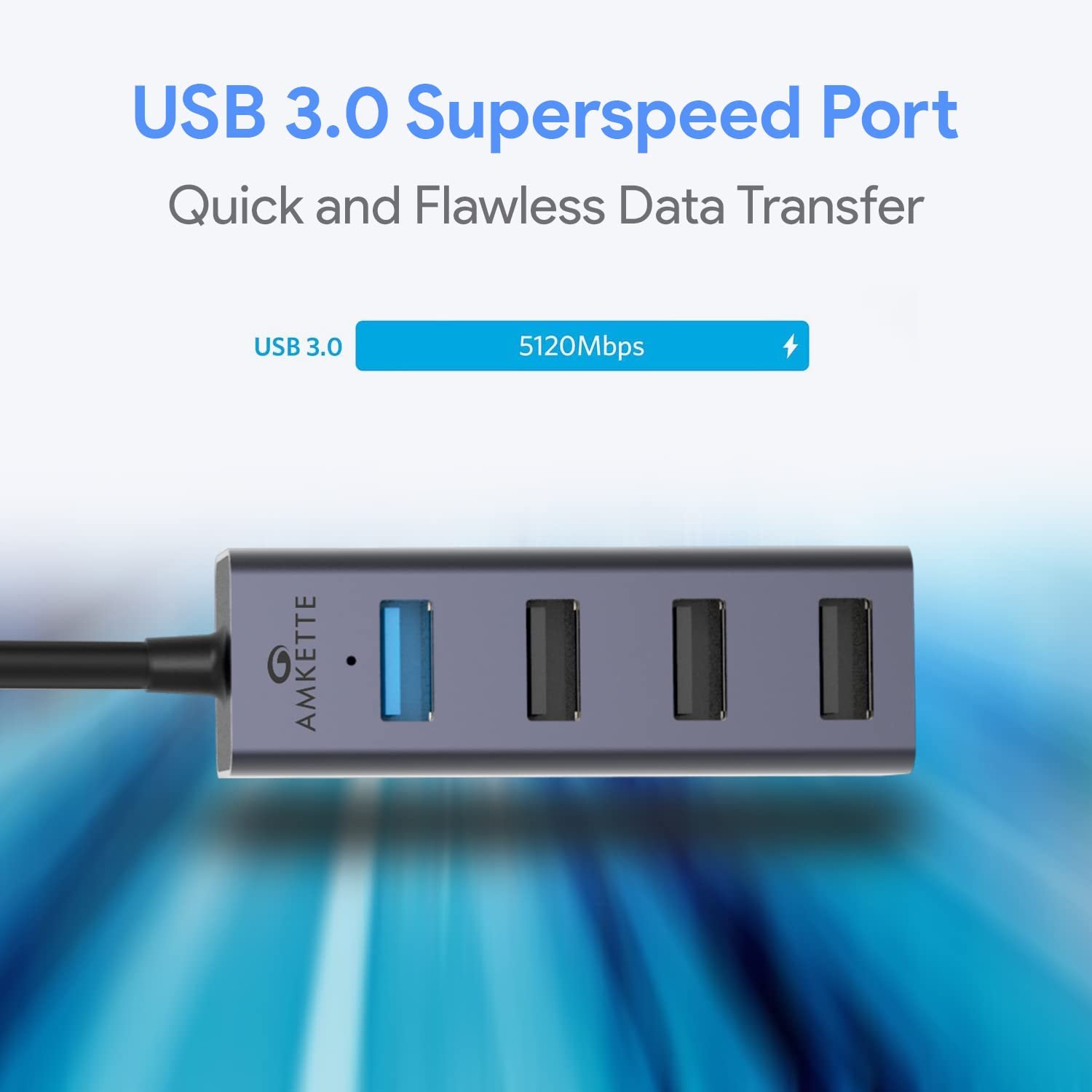 The Amkette 4 Port USB 3.0 Hub offers 1 USB 3.0 Port along with 3 USB 2.0 Ports. The USB 3.0 Port allows for data transfer speed of 5 Gbps while the USB 2.0 Ports give you access to multiply your network needs.