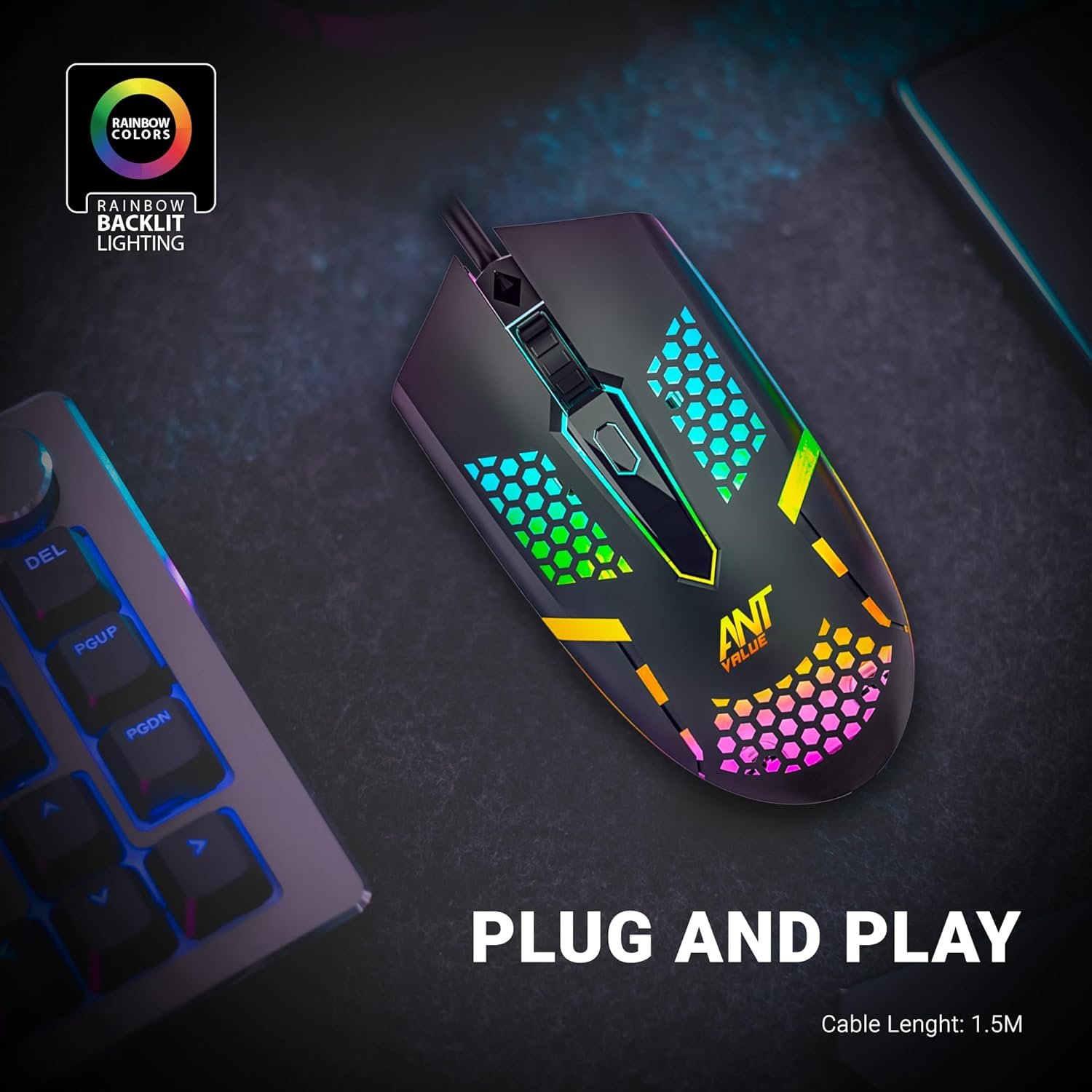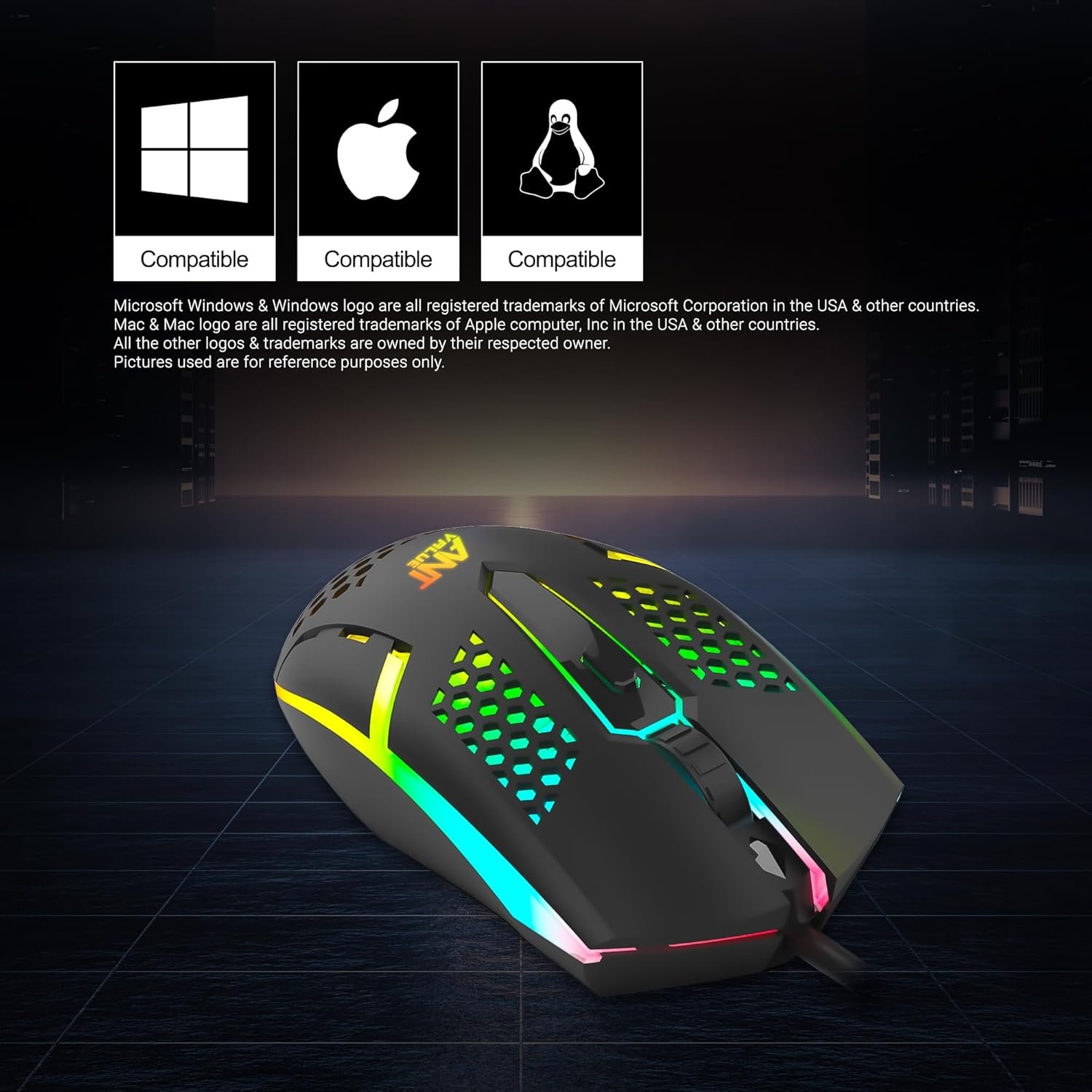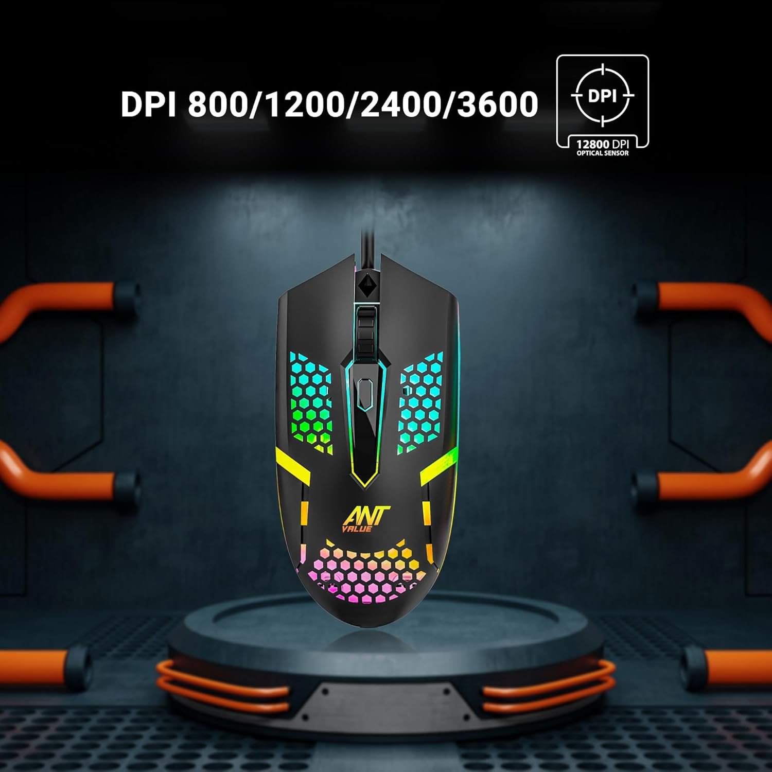 Ant Value GM1103 Gaming Mouse, USB Optical Computer Mice with RGB Backlit, 4 Adjustable DPI Up to 3600, Ergonomic Gamer Laptop PC Mouse for Windows 7/8/10/XP Vista Linux -Black