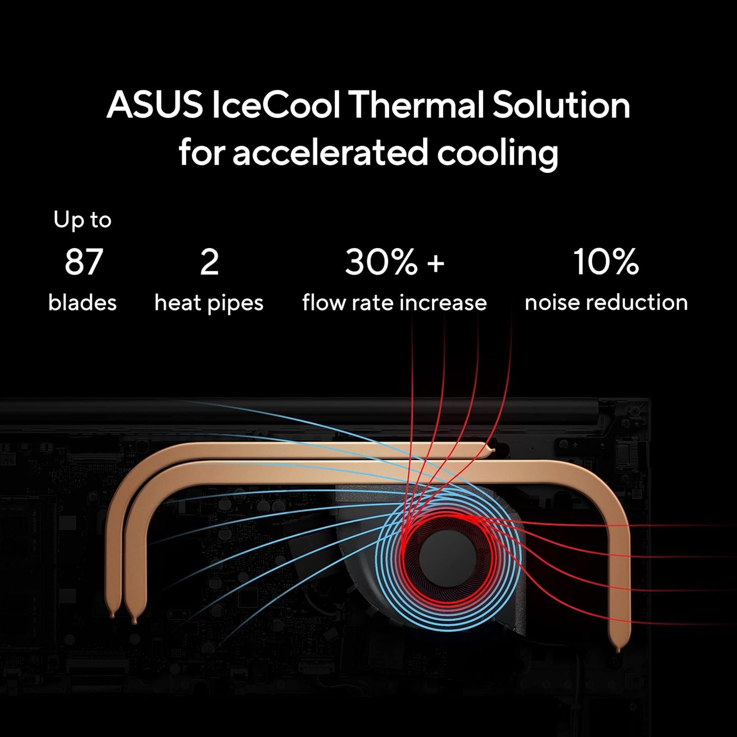 Each model in the new Vivobook series provides exceptional heat dissipation via two upgraded heat pipes and a new IceBlades fan that efficiently accelerates heat transfer. The 87-blade IceBlades fan and impeller are made of a liquid-crystal polymer that allows them to be lighter and thinner. Each IceBlades fan blade has a 3D-curved aerodynamic design, allowing the fan to achieve better flow rate and lower noise. In addition, the IceBlades fans also use a fluid-dynamics bearing, which can achieve better vibration reduction and lower noise.