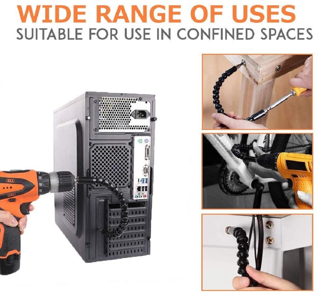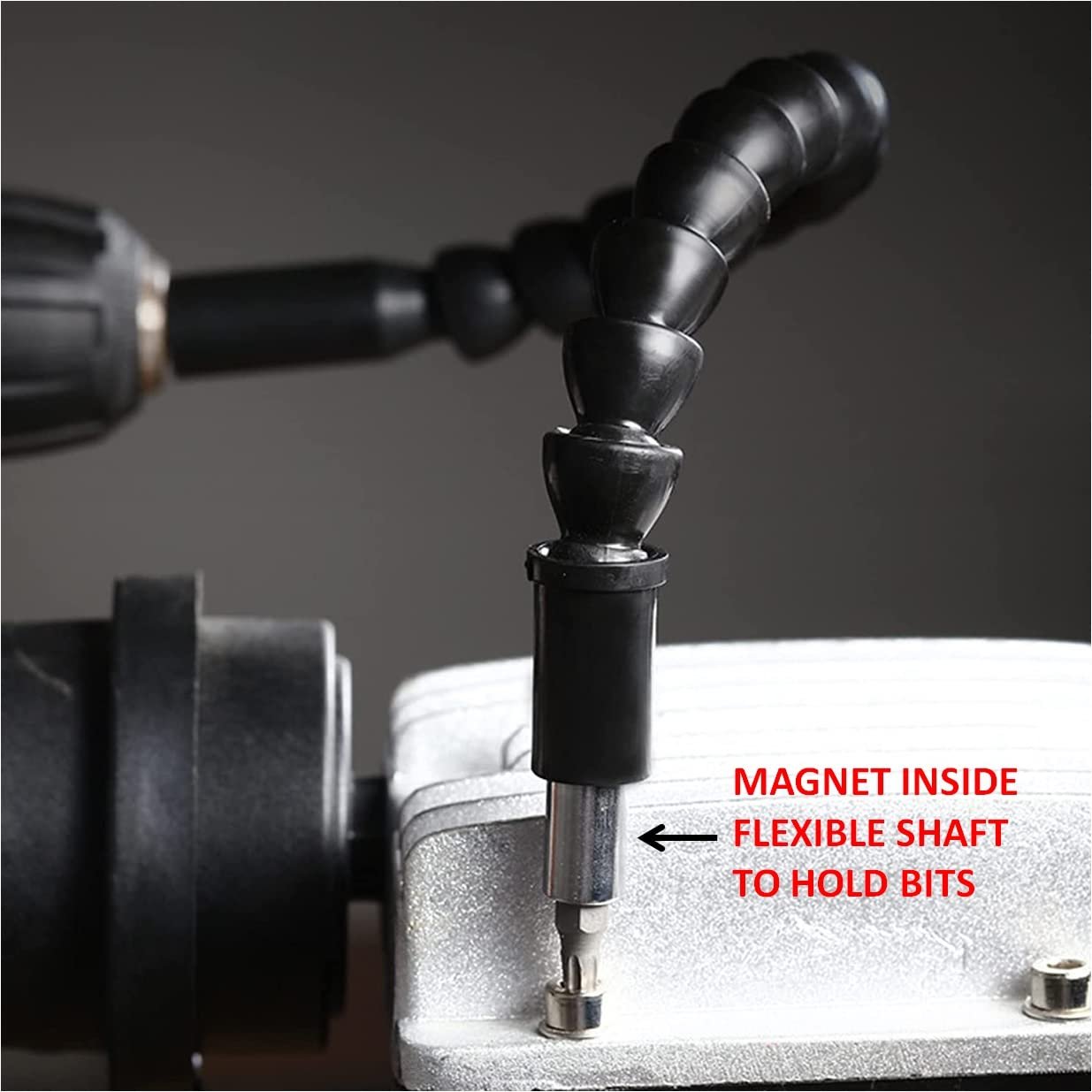 Flexible shaft has strong magnet to holds bits securely. 11.8 inch long flexible shaft extension bit can bend; twist to work in narrow confined spaces.