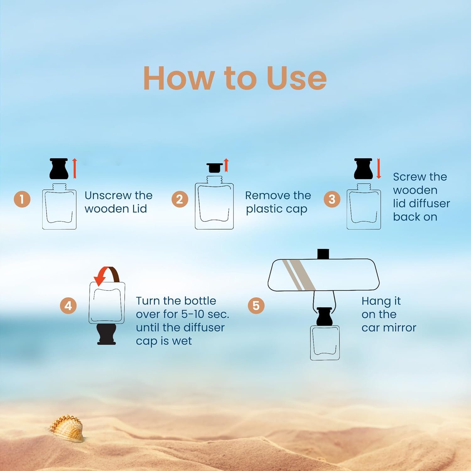 [HOW TO USE & WHAT NOT TO DO] – <1> Unscrew the wooden diffuser cap. <2> Remove the plastic stopper. <3> Screw back wooden diffuser cap. <4> Invert the bottle for 10 seconds & hang inside rear view mirror. Repeat step 4 after 7-10 days. MAKE SURE TO – tie the thread TIGHT & SMALL IN LENGTH to prevent collision with windshield on rough roads.