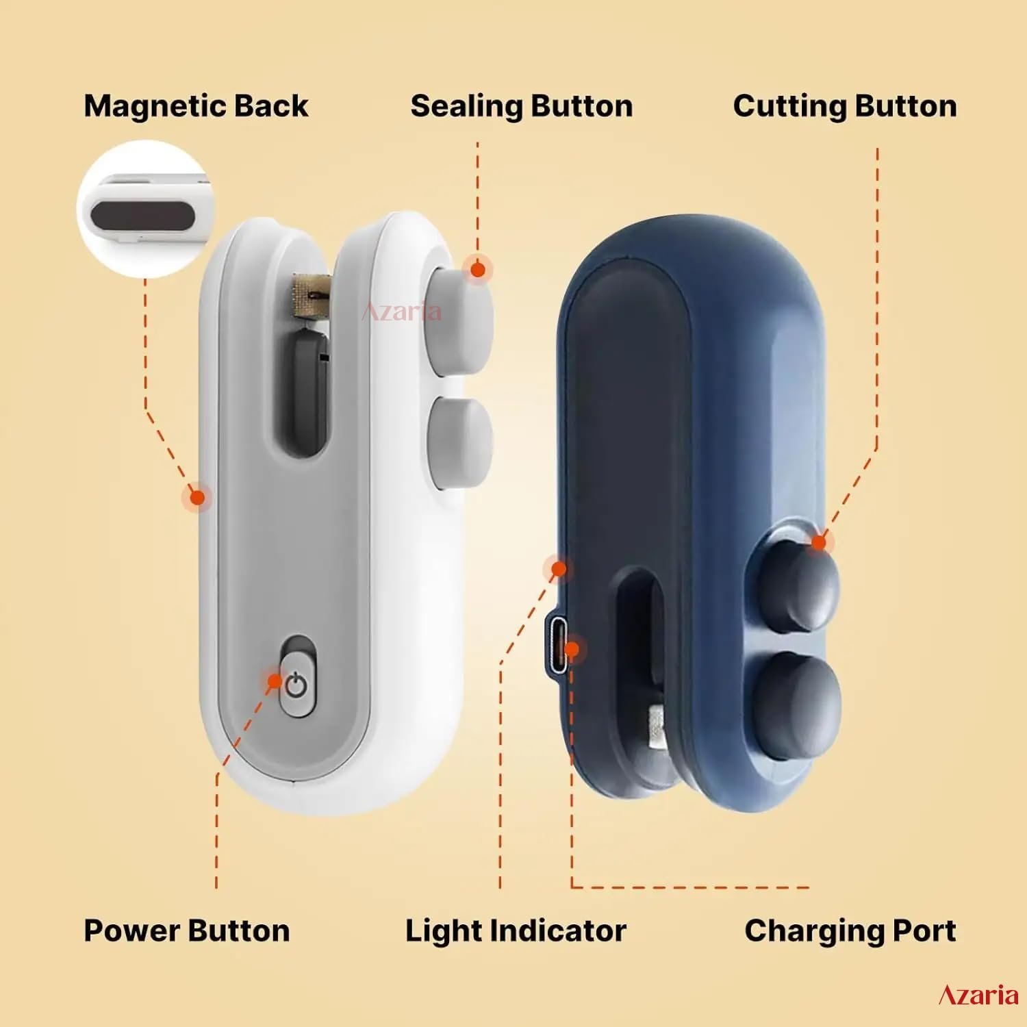 Azaria portable sealing machine is a 2-in-1 packet sealer tool that seals and cuts packets with ease. Ideal for keeping food fresh, the mini sealing machine is perfect for sealing vacuum or snack bags to prevent spoilage. The built-in stainless steel blade allows for quick and smooth packet opening, making it a must-have gadgets for daily life.