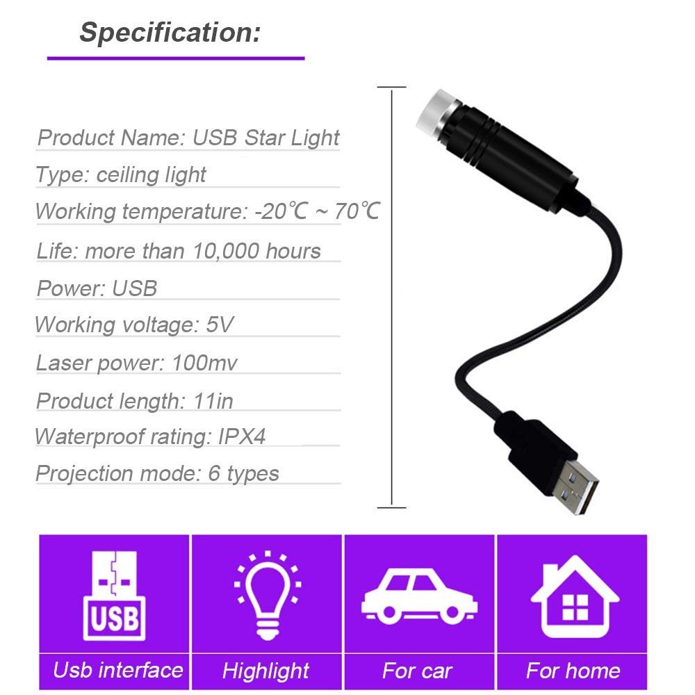 Multi-Pattern Change Through rotating the head of star projector, you can enjoy many projection patternsEasy to Use Mini plug-in USB interface fit for all cars, indoor decoration with USB ports. Mini size, easy to put in your pocket or bag, very convenient