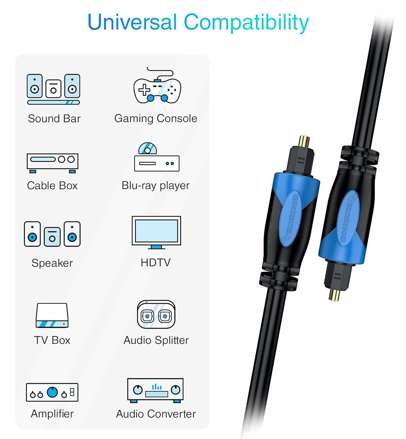 ➤Universal Compatibilty: BlueRigger optical audio cable is compatible with Soundbar, Home Theatre, HDTV, Game Consoles (Xbox, PS4 etc), Blu-Ray Player, DVR, DAC, Audio Processor, Receiver/Preamp etc. Compatible with Toslink, S/PDIF and optical ports