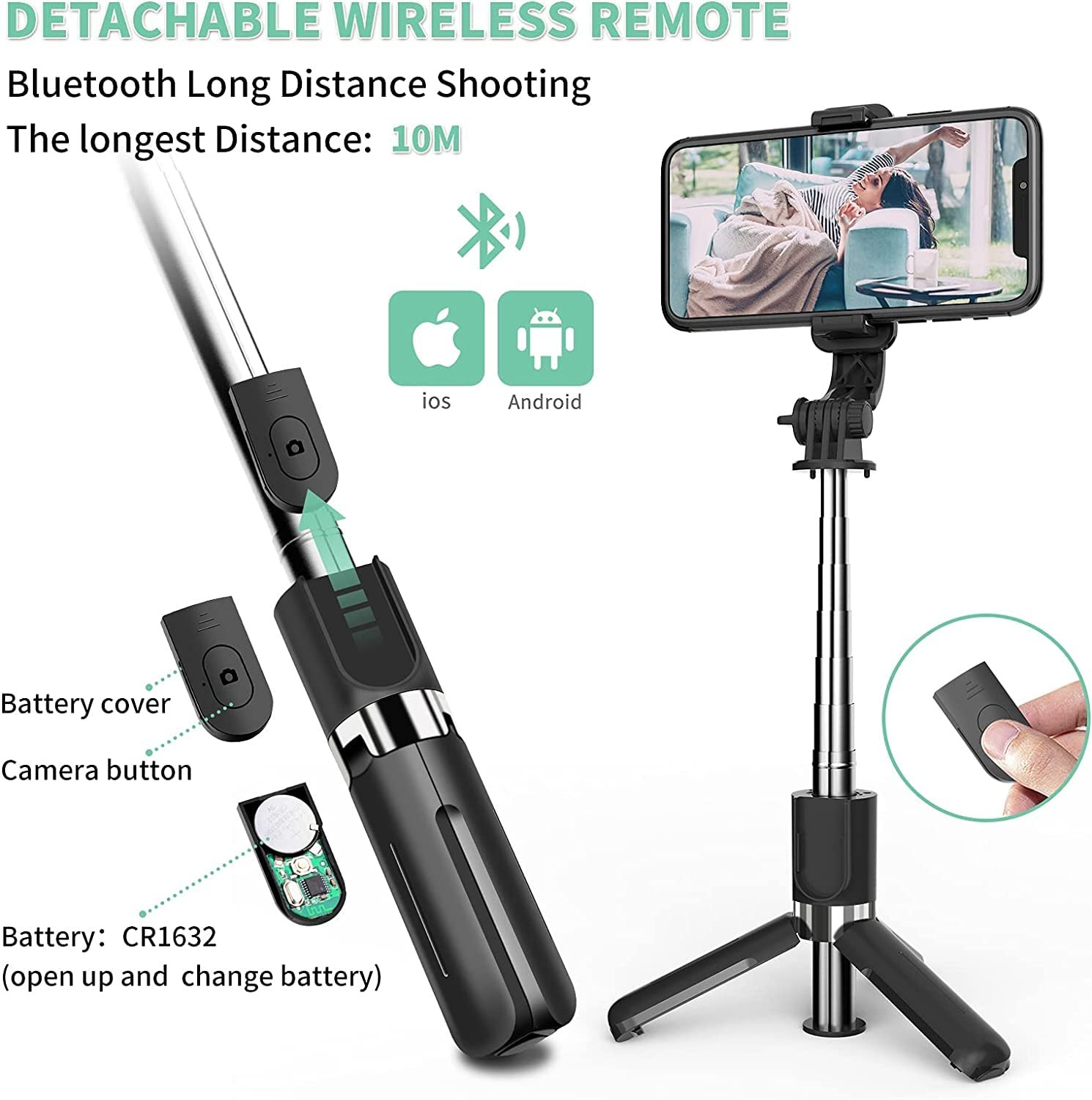 The control distance is up to 32 feet. Not only can we press the button to take selfies easily, but also turn on the handle and turn it into a tripod for taking group photos with your friends or family in the distance.