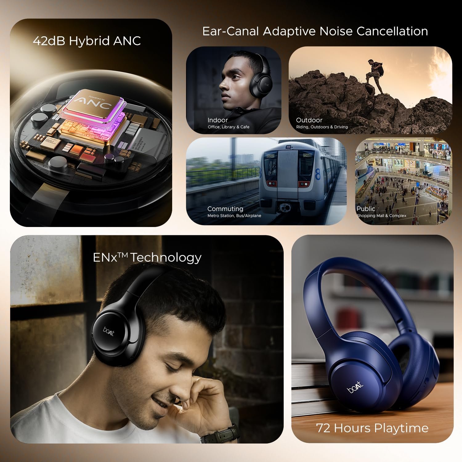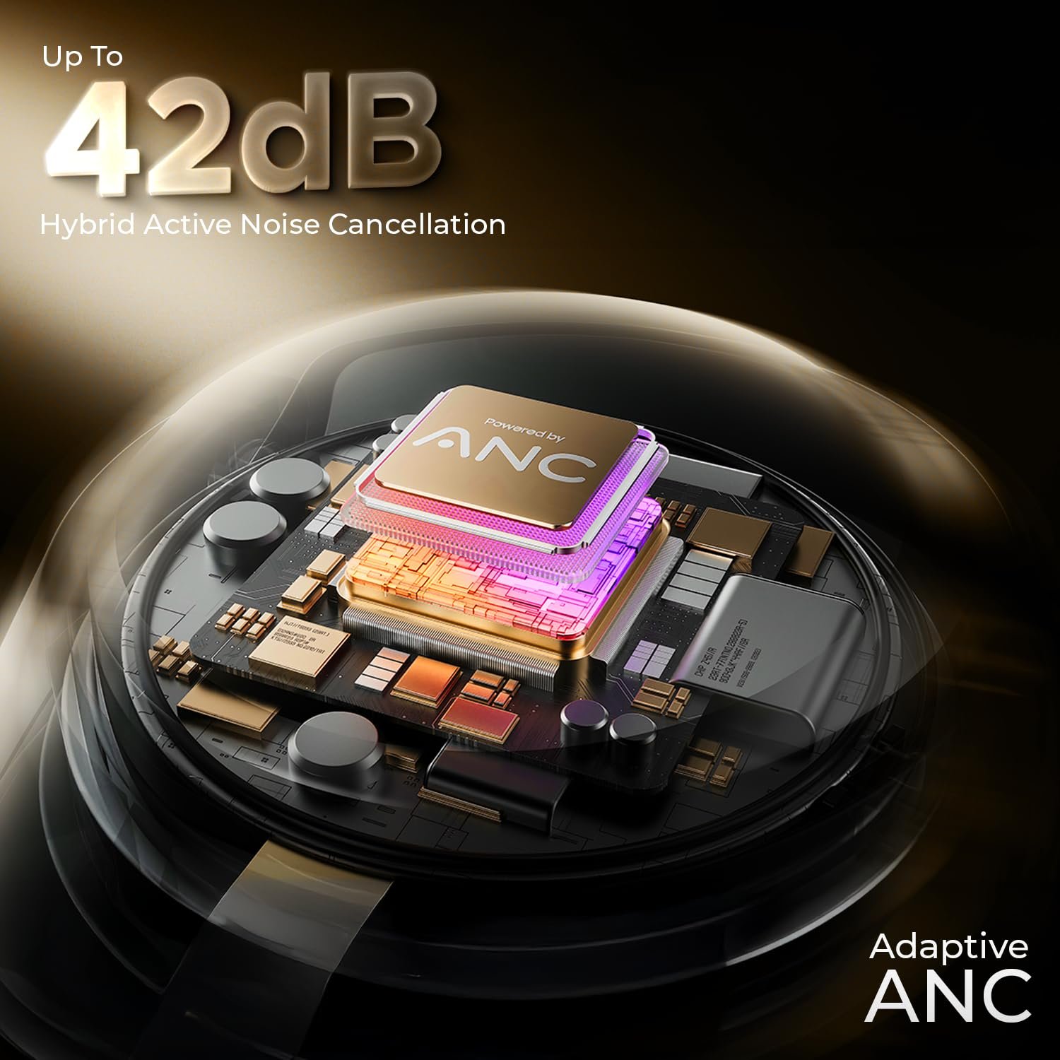 Its Ear Canal Adaptive ANC technology detects the ear canal structure and creates noise cancelling parameters upto a particular decibel(42dB max) basis your surrounding. You may choose different levels of adaptive anc(Commute, Indoor, noisy etc.) through the boAt hearables app!