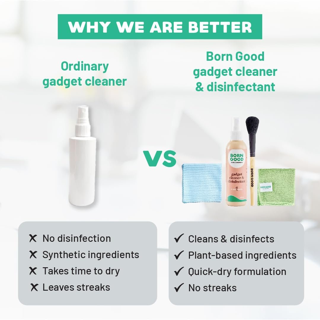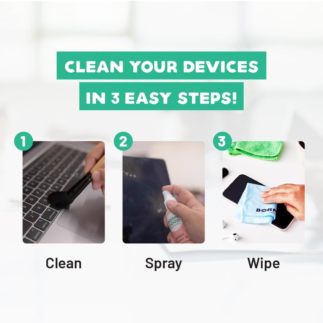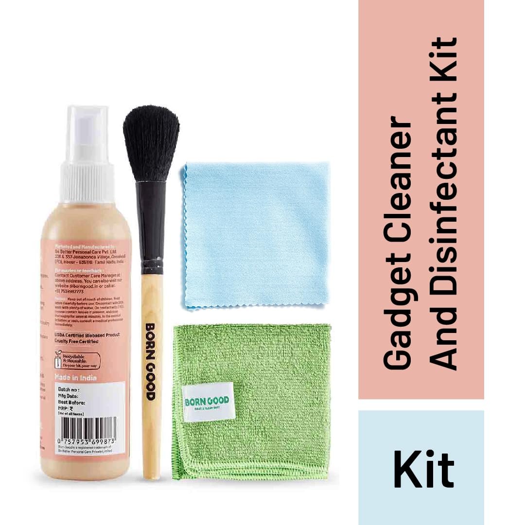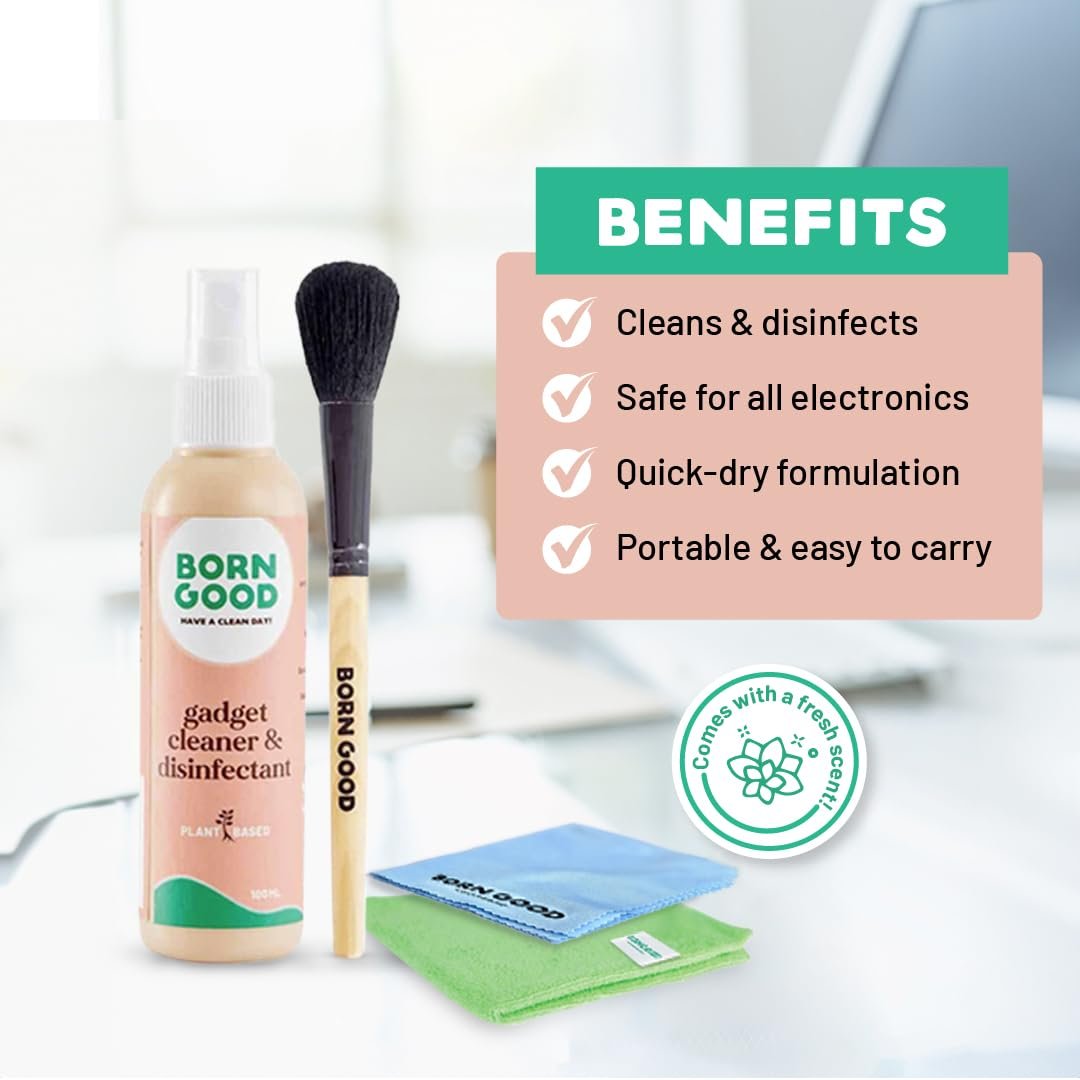 Born Good 4-in-1 Plant-Based Electronics & Gadget Disinfectant Cleaner Kit – Non-Toxic Formula for Laptop, Smartphone, Monitor, Tablet, Camera, TVs – 2 Microfiber Cloths & Soft Brush (100ml)