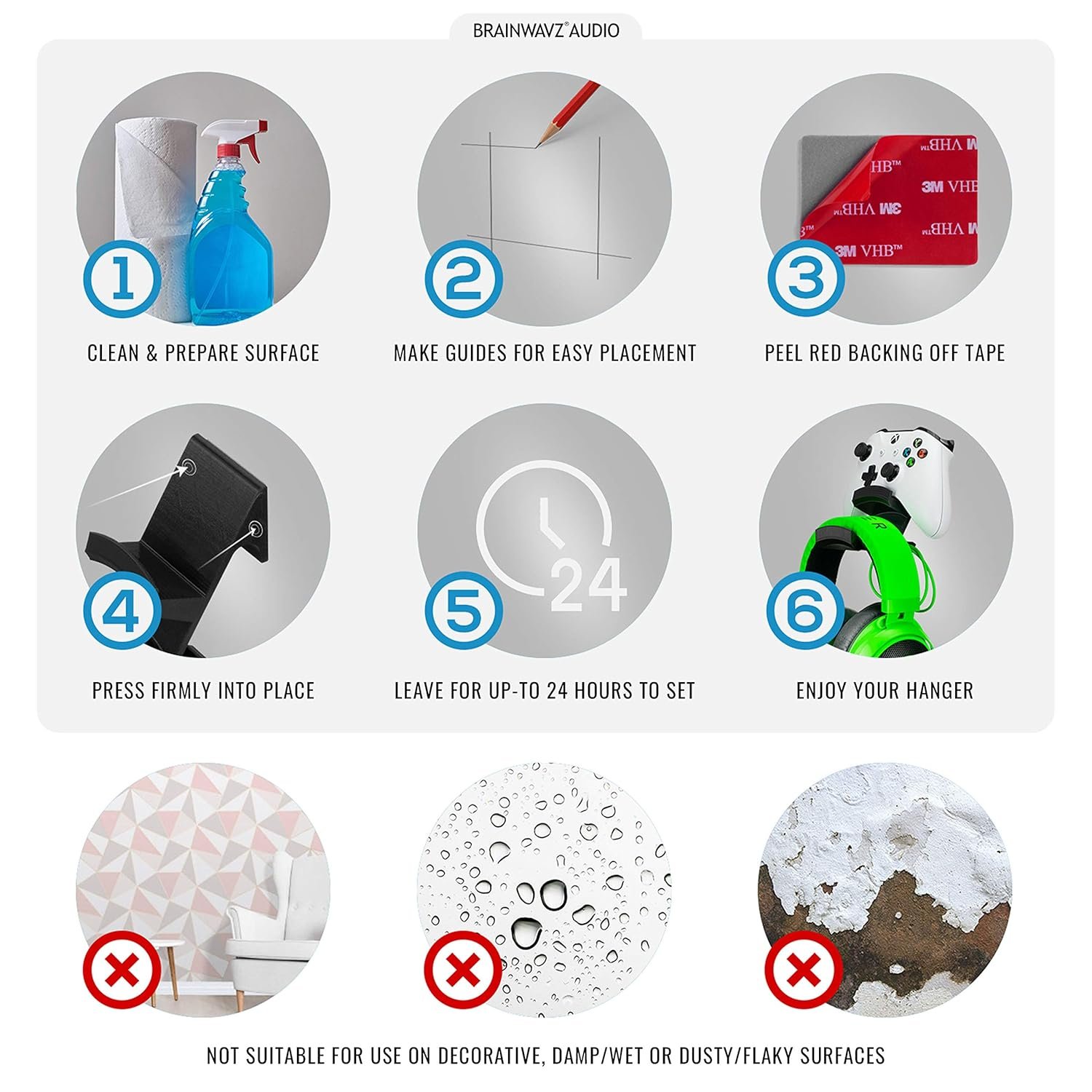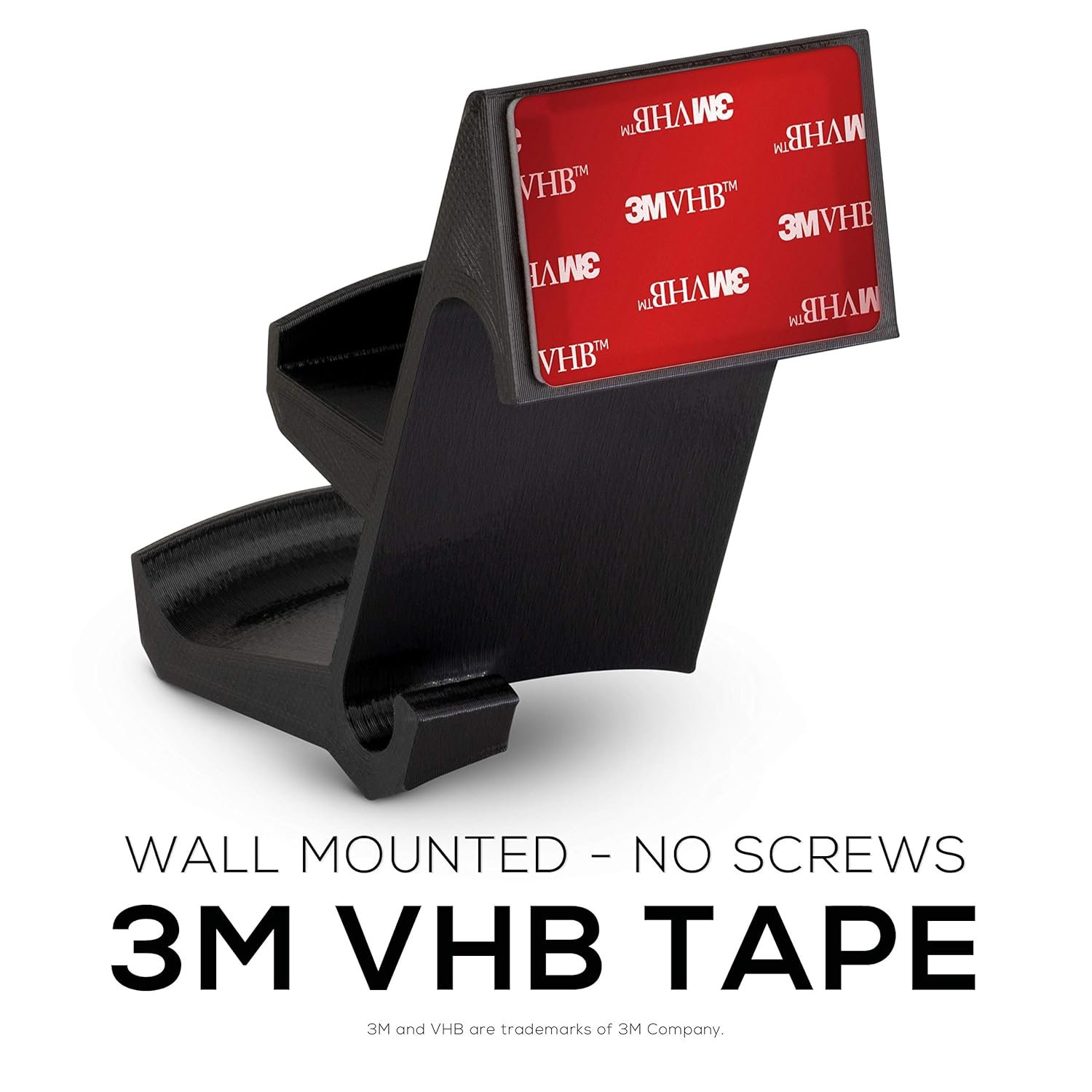 Strong 3M VHB adhesive tape For use on walls, shelves and any vertical surface Bigger platform for a wide variety of headphones and controllers Holds 1 sets of headphones and 1 controller Integrated cable hook Great for displaying your gaming collection Keep your gear safe and out of the way when not in use