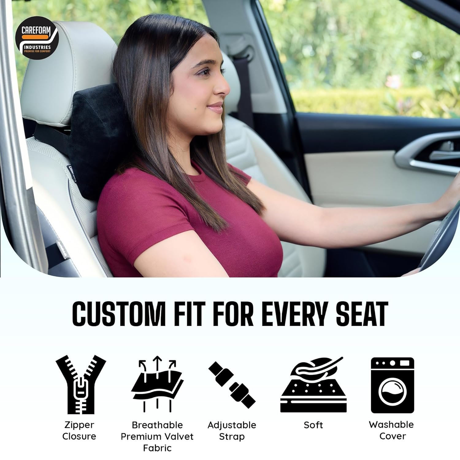 Optimised Softness and Durability: The Memory Foam perfectly balances softness and long-lasting support, conforming to your neck for personalized comfort and ensuring durability over time. – **Universal Fit for All Cars**: Compatible with all types of vehicles, featuring an adjustable strap for effortless installation on any car seat and ensuring the pillow stays in place.
