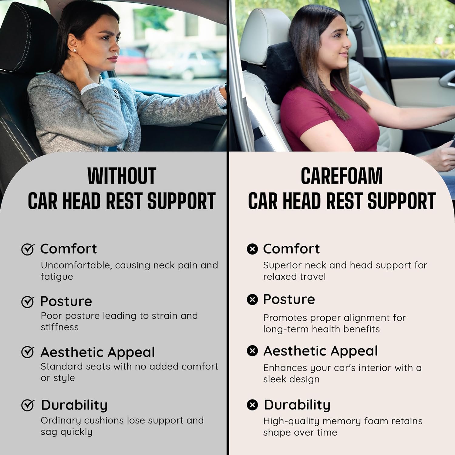 Promotes Proper Posture: Encourages correct driving posture through its ergonomic design, lessening stress on the neck and head. Utilizes our unique high-performance foam that retains its shape even with extensive use, providing consistent support and comfort.