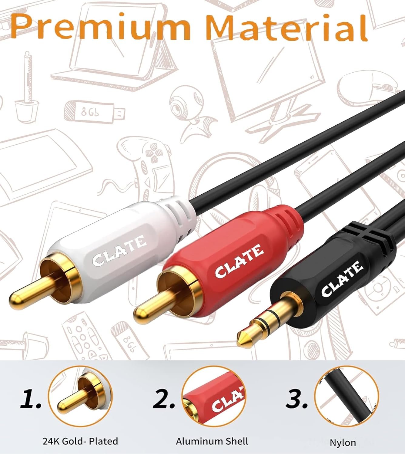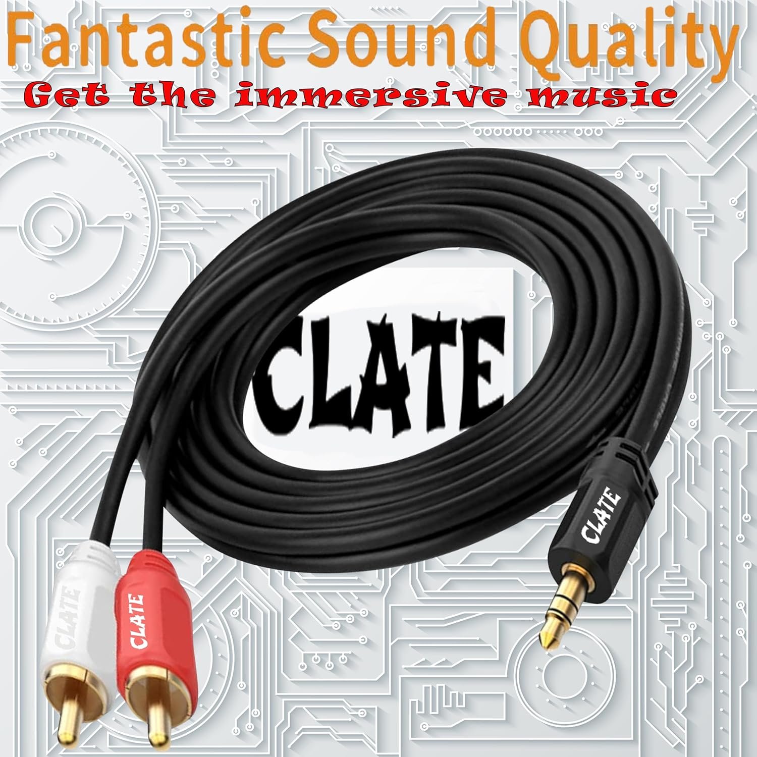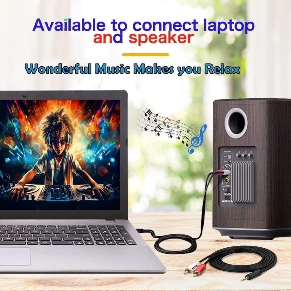 CLATE Male to Male: 3.5mm to 2 RCA stereo cable is suitable for plugging the 3.5mm connector into the headphone jack of your mobile device and the 2 RCA connector to the port on your sound system.