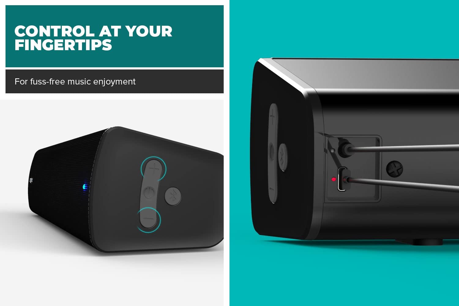 The playback and volume control buttons are conveniently located on the side of the soundbar with LEDs that indicate status on its front panel.