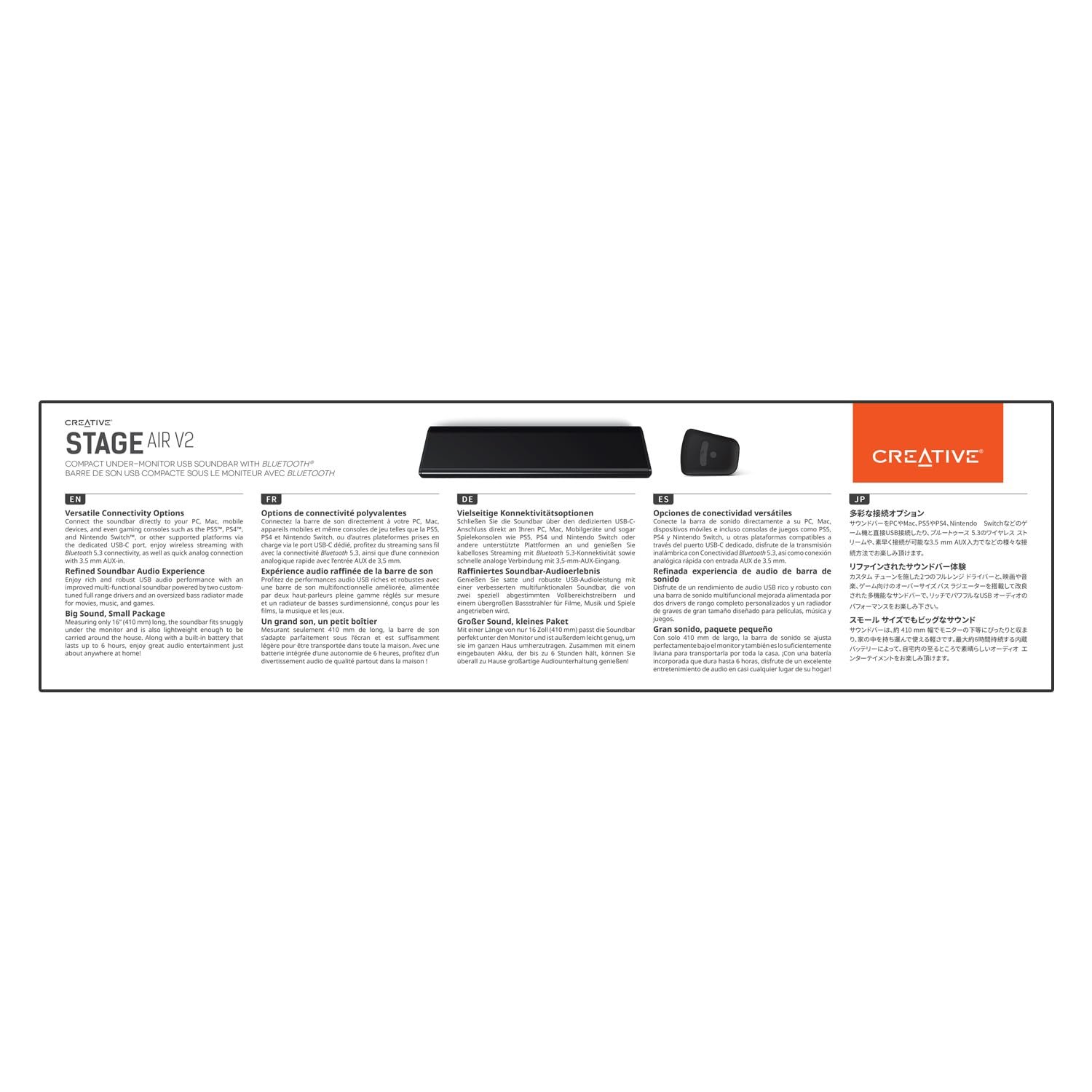 VERSATILE CONNECTIVITY OPTIONS – The Creative Stage Air V2 joins the Creative Stage series to offer both USB-C audio and Bluetooth 5.3 options. With both wired and wireless playback capabilities, you can connect it directly to your PC, mobile, or even gaming consoles (compatible with the PS5 and Nintendo Switch) for high-quality digital audio. It also comes with a 3.5 mm AUX-in port that allows for compatibility across other analog devices