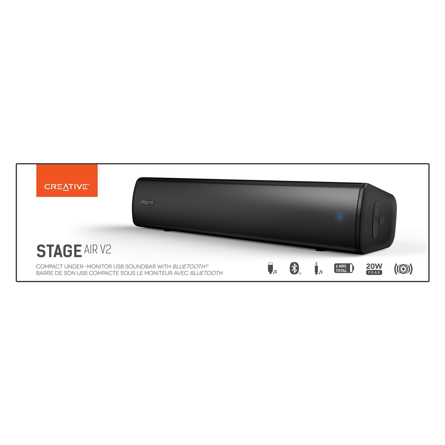 Built for an intimate setting like your desktop, the Creative Stage Air V2 is designed to fit effortlessly into your existing setup with minimal clutter. This small but mighty PC soundbar joins the Creative Stage series and offers both high-quality USB digital audio and wireless Bluetooth 5.3 options for versatility. It also comes with up to 6 hours of battery life so you can bring your music with you anywhere around the house, without being tethered to a power source. Custom-tuned to deliver astounding audio despite its compact build, the Creative Stage Air V2 brings out the best in your movies, games, and music.