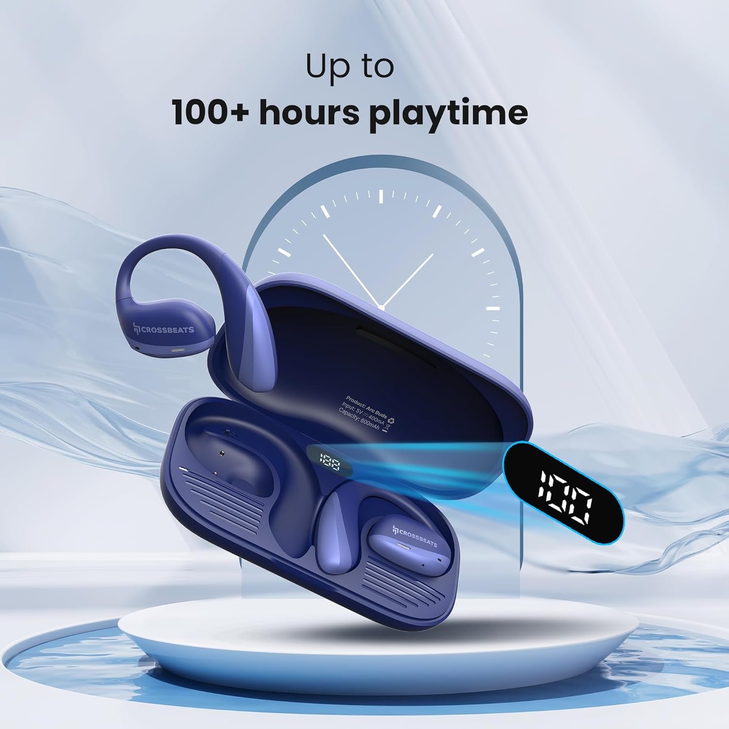 🔋UPTO 100 HOURS PLAYTIME: With the 150mAh high-density battery and the latest Energy Lock technology, Crossbeats Arcbuds Open-Ear Bluetooth headphones provide 28 hours of continuous playback per charge and upto 100 hours by using the charging case. And thanks to the fast charging technology, these earbuds support 6 hours of continuous playback after only 15 minutes of charge.