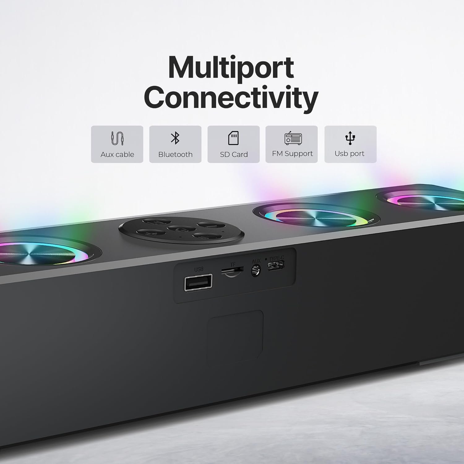 [STRONG HD SOUND] This 30W sound bar come with two premium speakers with 4 passive radiators, and 2400 mAh batteries produce crisp surround sound that immerses you in the music. Additionally, this soundbar comes with Karaoke and party lights that transforms it into your very own audiovisual hub.