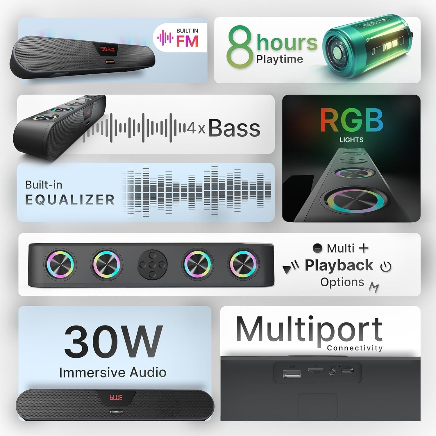 Blaze B30 is the 1st ever soundbar in India to have Quad Diaphragm setup along with two powerful speakers. Perfect for movies, music, and gaming, B30 offers easy Bluetooth connectivity, multiple input options, and customizable sound settings. Transform your space with immersive audio in a compact package.
