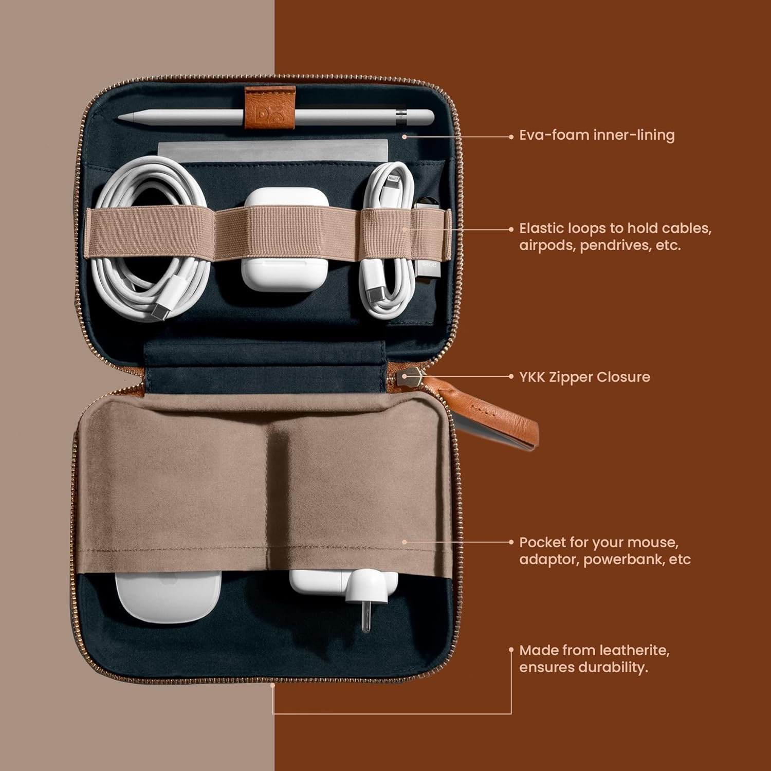 ✅ ZIPPER CLOSURE – Concealed YKK zipper with seamless leather puller for complete security. When zipped down, this organiser case lays flat on the surface for convenient access and stashing. The electronic organizer bag is designed to make optimum use of space. Elastic loops on one side stitched to hold cables of all sorts, firmly. Eva-foam sheet affixed to hoard, memory cards, pen-drives, etc.
