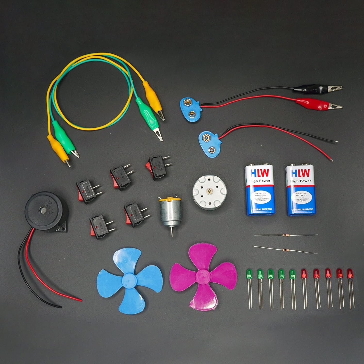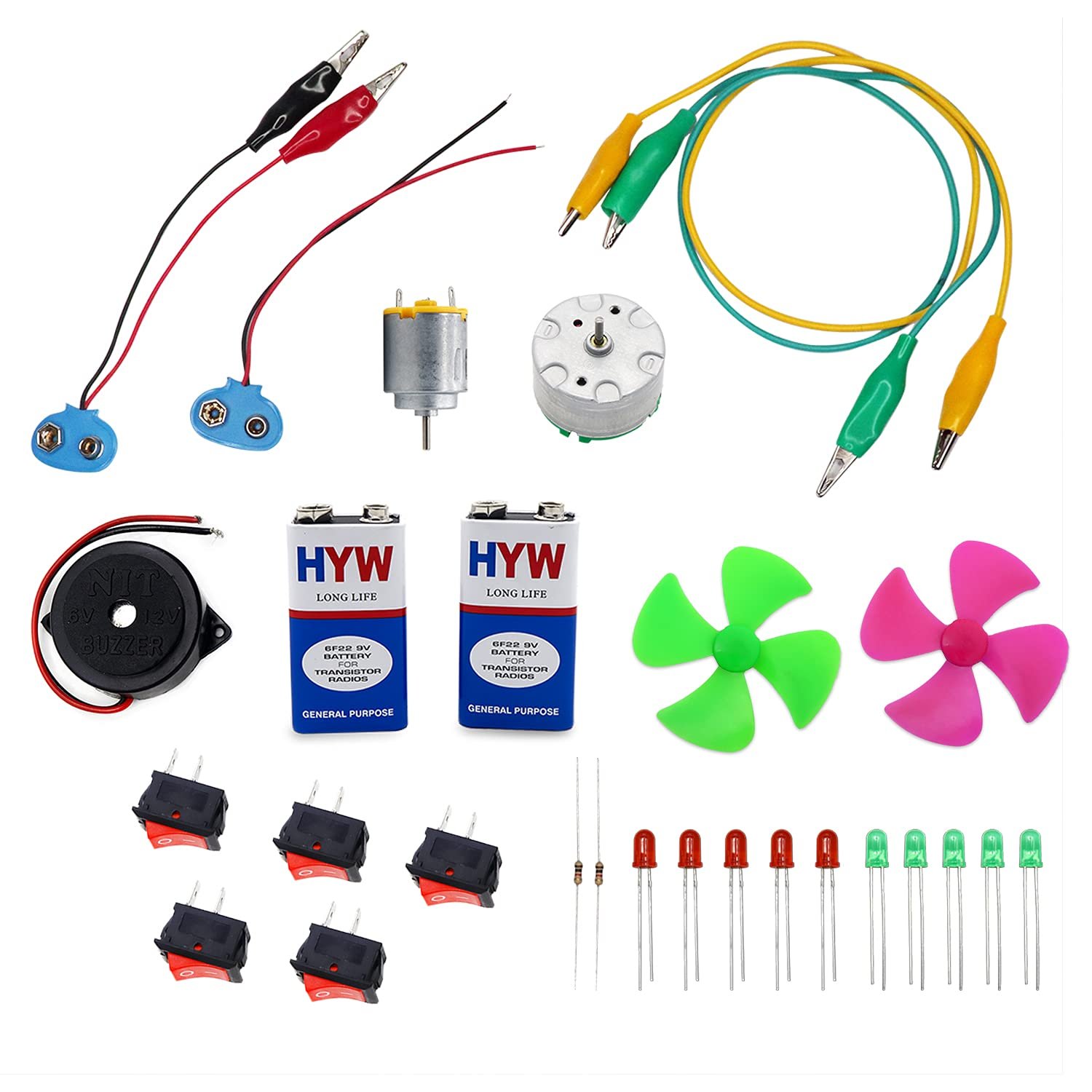 It includes all of the basics: wire, LEDs, resistors, and pushbutton switches motor , buzzer ,Different Type of propellers, Diy different Type of electronic projects .