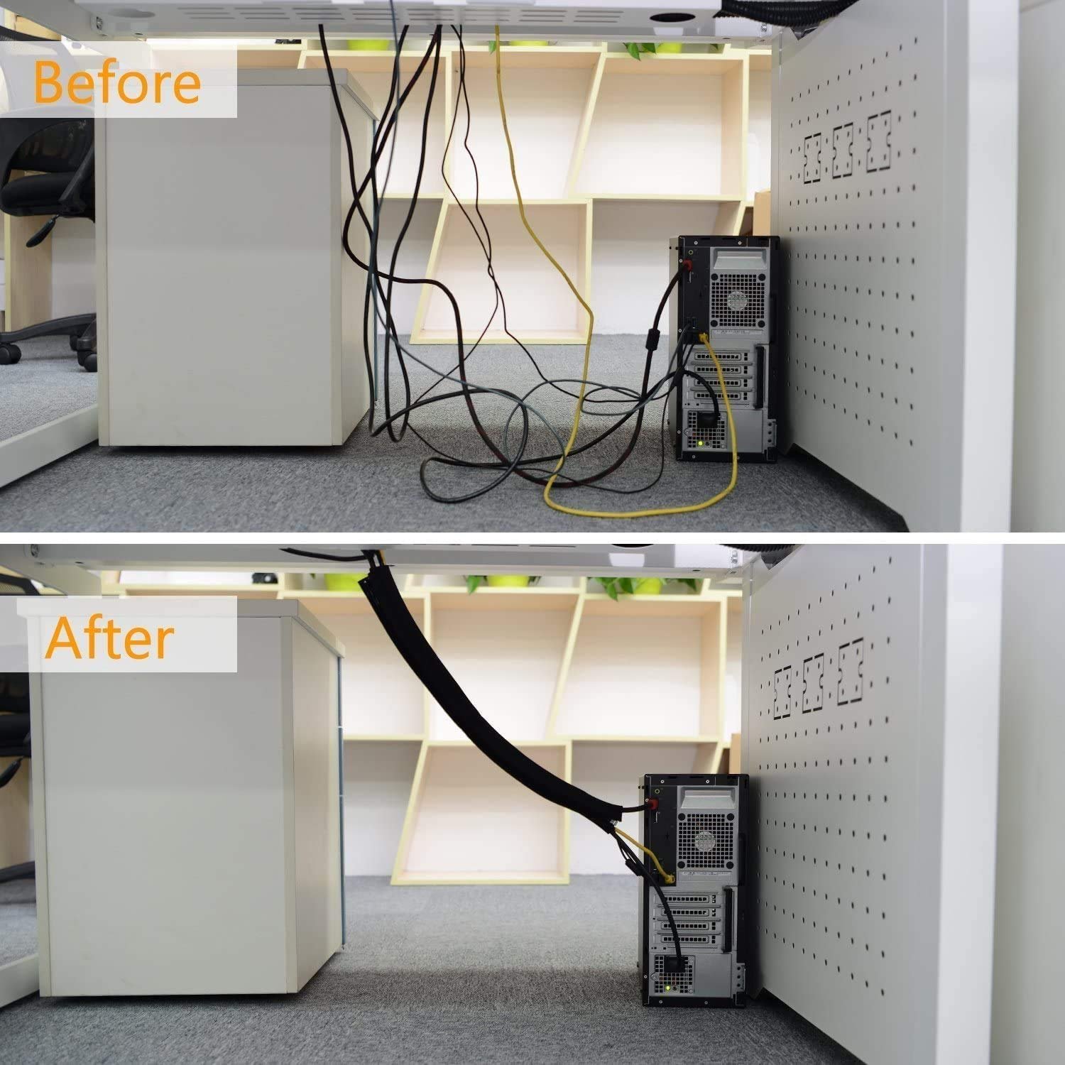 No more worrying about unsightly mess of tangled cables! With our quality cable management sleeve, you can easily manage all kinds of cords, cables and wires in your home and office well-organized and out of sight. The cord concealer is essential for keeping baby from hazards and protecting your wires from being chewed by a curious pet, bringing you a safe, comfortable and enjoyable working and living environment.