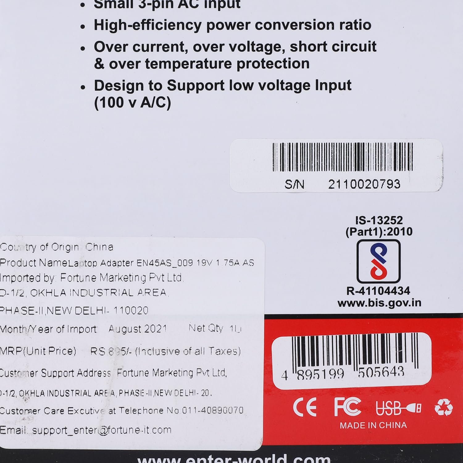 This 45W laptop adapter from Enter has an input voltage of 100-240 volts and universally accepted frequency of 50Hz-60Hz to help you charge Asus laptops. Designed with 3 pin input which leads to minimize power consumption. It is portable and easy to carry. Easily connect it to your laptop and get going with your work. Comes with Low ripple operating noise and high gloss casing. Equipped with a surge protector to guard your device against power fluctuations. The adapter is lightweight for ease of use. Easily plug it into any wall outlet to deliver AC power to your laptop. 1 Year Warranty by Enter on Adapter Part. Package does not include power cord. Check Pin size before placing the order.