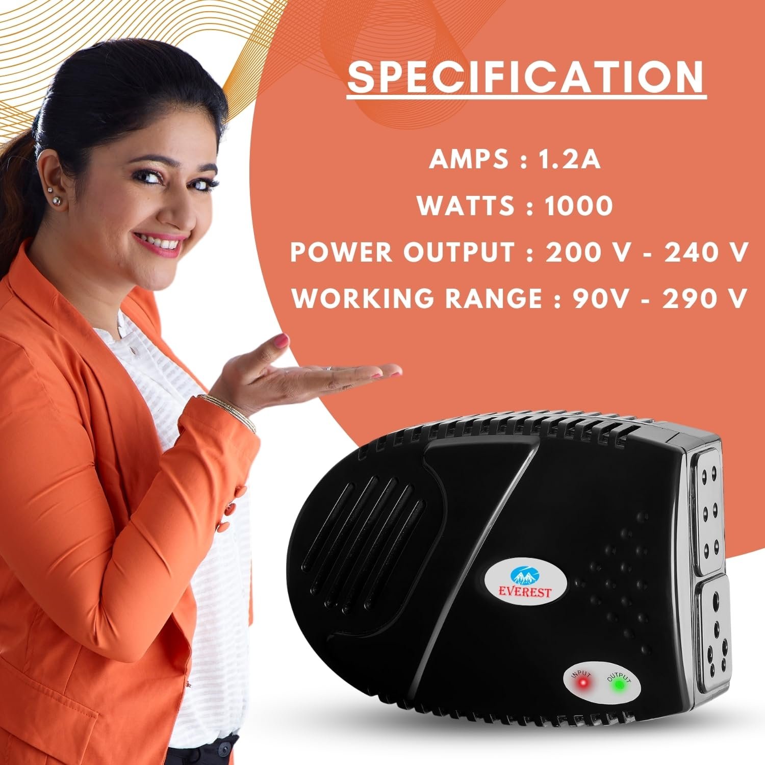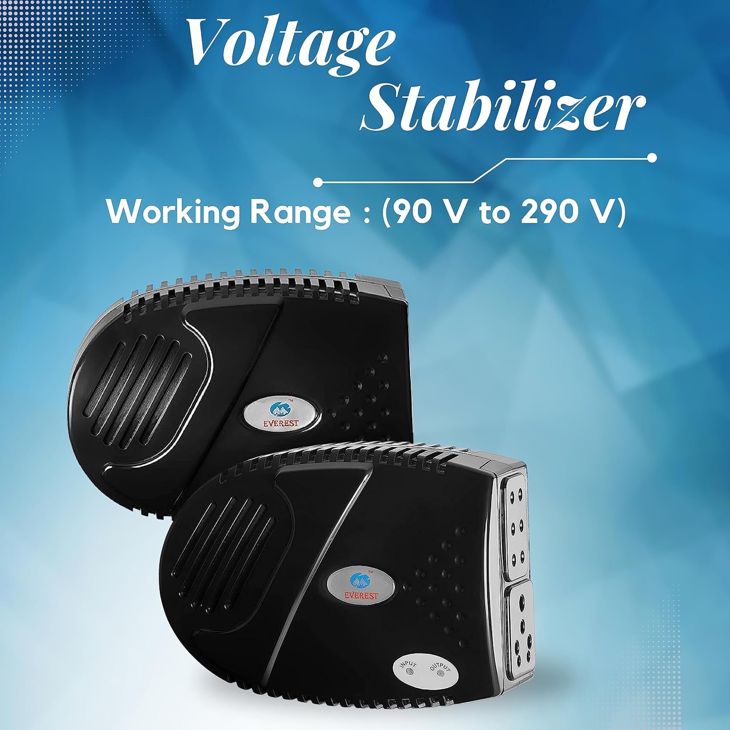 User-friendly display / Power-saving technology , Copper Windings, Space-saving compact design High and low voltage managementOptimum Quality Performance by the utilization of Sophisticated Solid State Circuitry TechnologyWorking Range : 90 V to 290 V , Input 170v – 270v , Output : 200v – 240v ,Low/High Voltage Cutt off / Attractive ABS Body,40% Current saving noiseles.