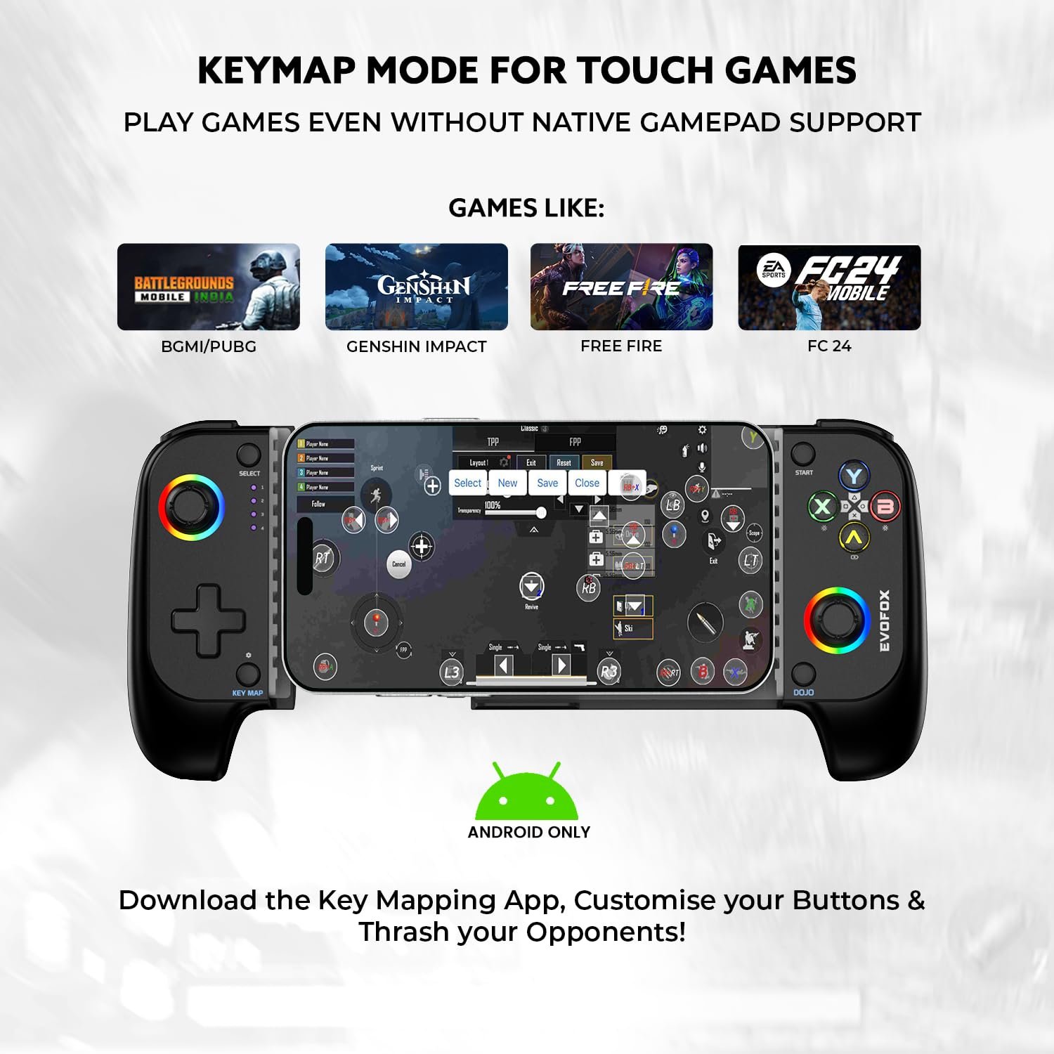 𝗞𝗲𝘆𝗺𝗮𝗽 𝗠𝗼𝗱𝗲 𝗳𝗼𝗿 𝗧𝗼𝘂𝗰𝗵 𝗚𝗮𝗺𝗲𝘀: Map touch points to the controller and play non-gamepad games like BGMI, Free Fire, Genshin Impact (on Android), and Mobile Legends, expanding your gaming possibilities.