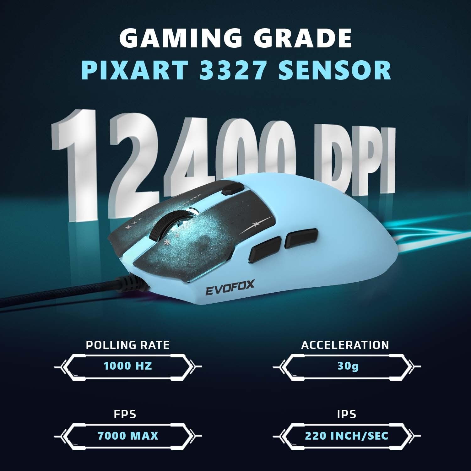 The EvoFox Ghost Air is a powerhouse of gaming performance. It features adjustable DPI settings up to 12400, 30g acceleration, 220 IPS tracking speed, and a maximum of 7000 FPS for smooth and precise control.