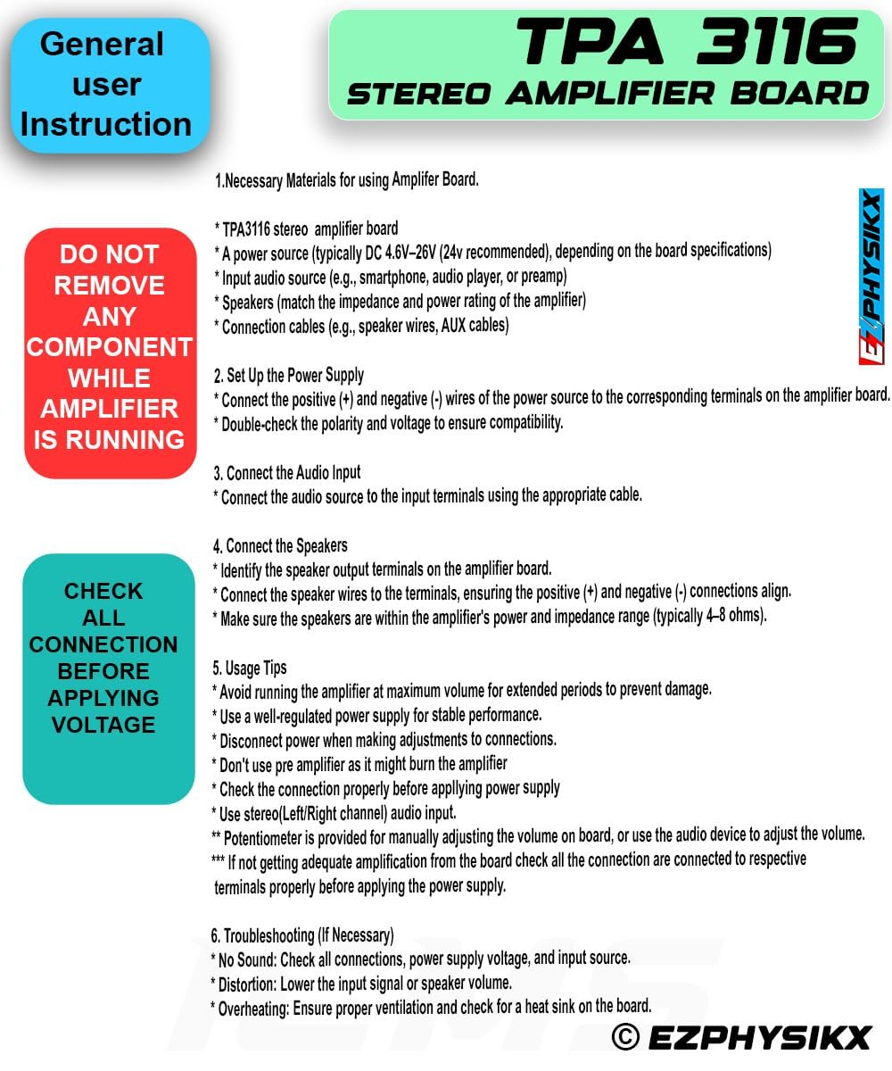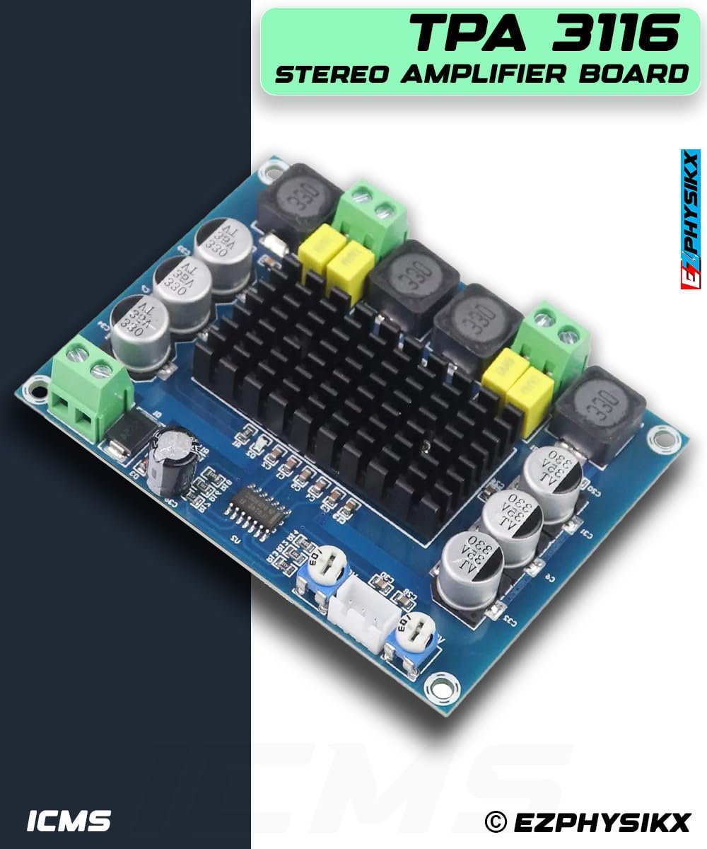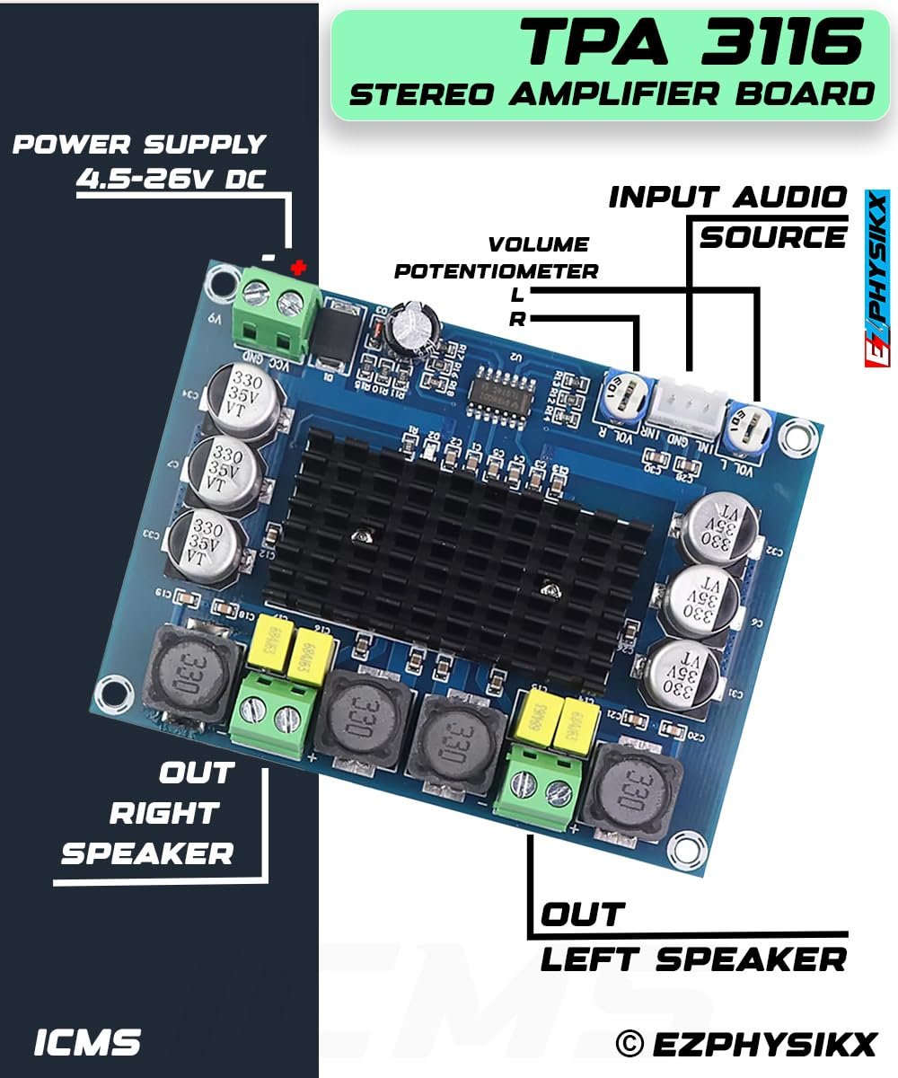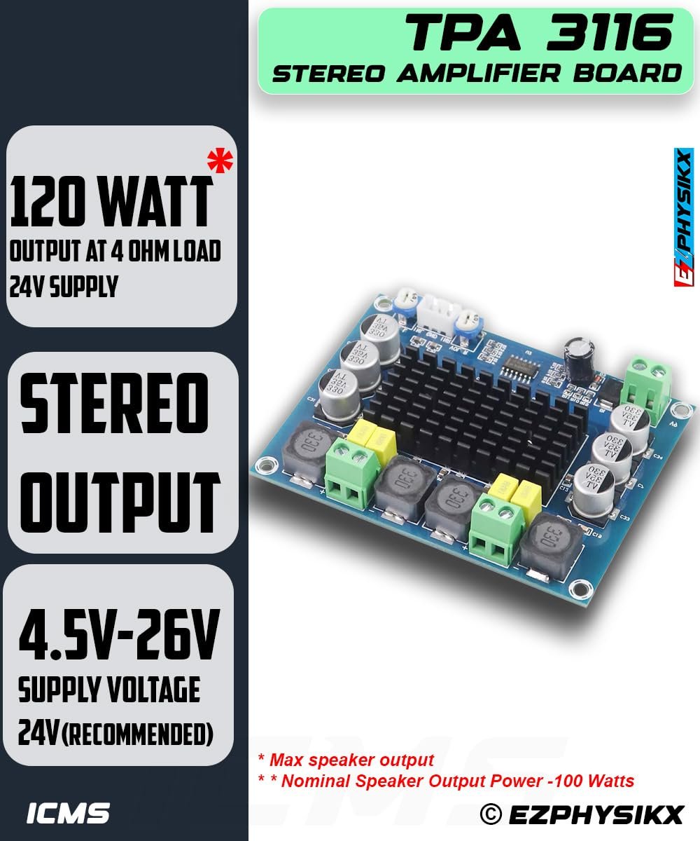EZPHYSIKX TPA3116 | TPA 3116 Stereo Amplifier Module, 120 watt, DC 4.5-26V, DIY Car Vehicle Computer Home Theater Audio System with Integrated speaker Protection Circuit. (TPA 3116 STEREO.)