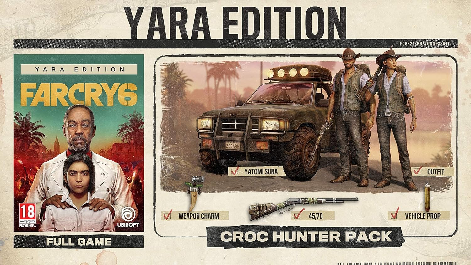 The yara Edition of far Cry 6 includes: base game; the croc Hunter pack – croc Hunter outfit, the 45/70 Rifle, the crocodile tooth weapon charm and the 45/70 Cartridge vehicle accessory