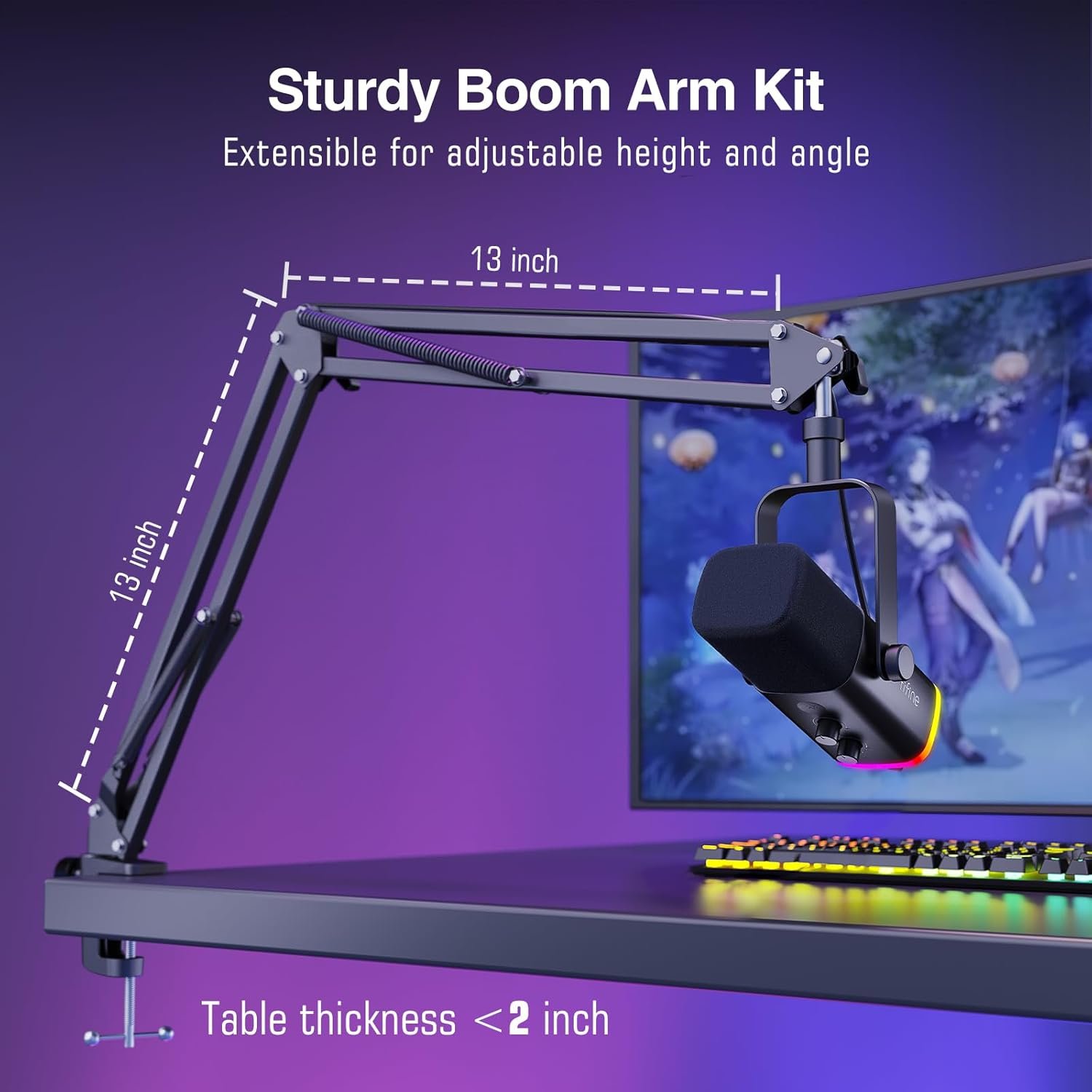 Enhanced Features-The PC gaming microphone USB kit includes a boom arm for easy positioning, mute button and gain knob for precise control, headphones jack for real-time monitoring, and headphone volume control.