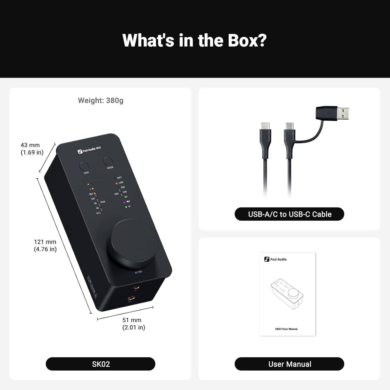 Compact Yet Powerful: The SK02 employs a minimalist and stylish design language. Despite its small size, it boasts mighty features. It supports DSD256 and PCM 32bit/384kHz high-resolution decoding, along with 3.5mm single-ended and 4.4mm balanced headphone outputs. Its robust power can easily drive wide range of headphones and IEMs with an impedance range of 16-300 ohms.
