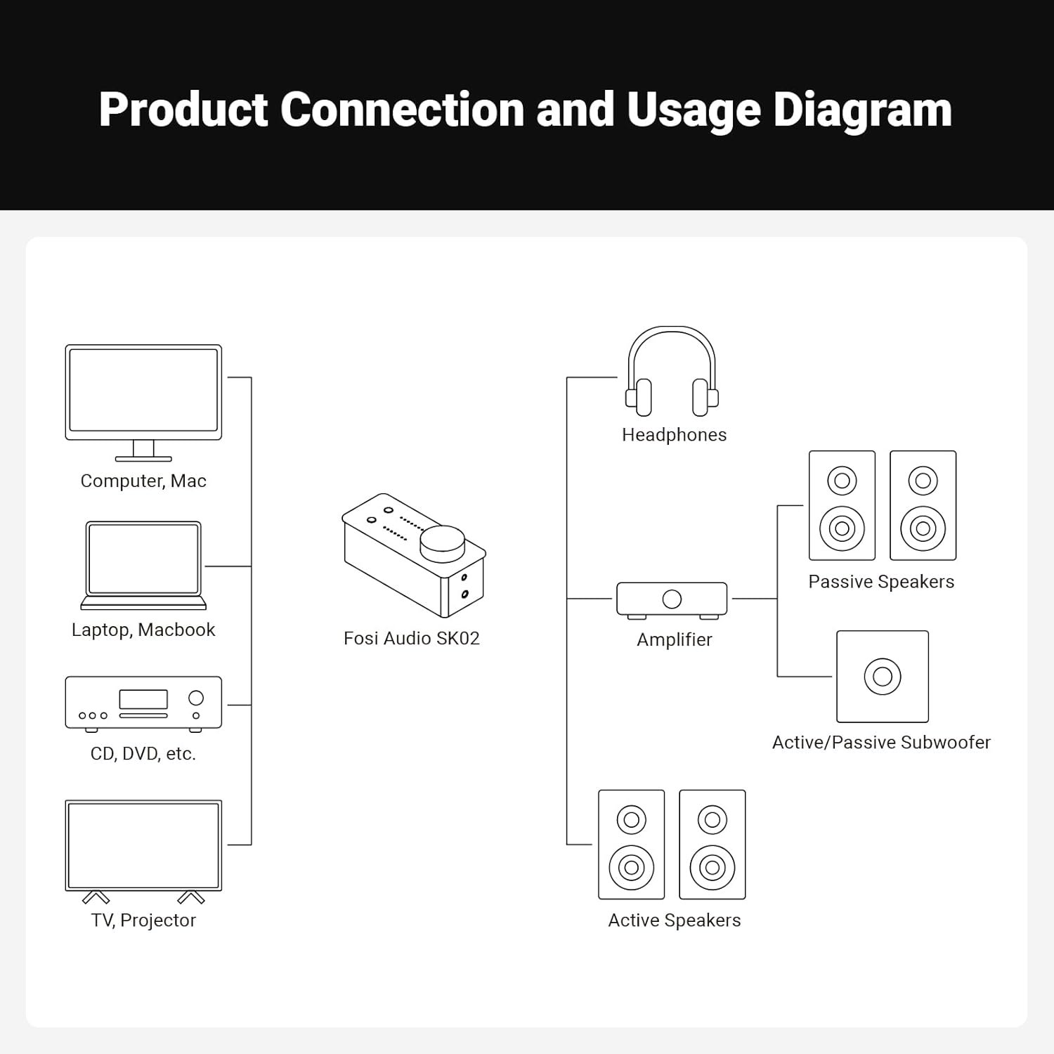Remarkable Versatility: Supports USB and optical input, widely applicable for decoding with computers, laptops, CD players, TVs, and projectors. Not only can it function as a headphone amplifier, but it can also serve as a preamp, pairing with active speakers or an amplifier like Fosi Audio V3, ZA3, TB10D amp and passive speakers to form a desktop listening or home audio system.