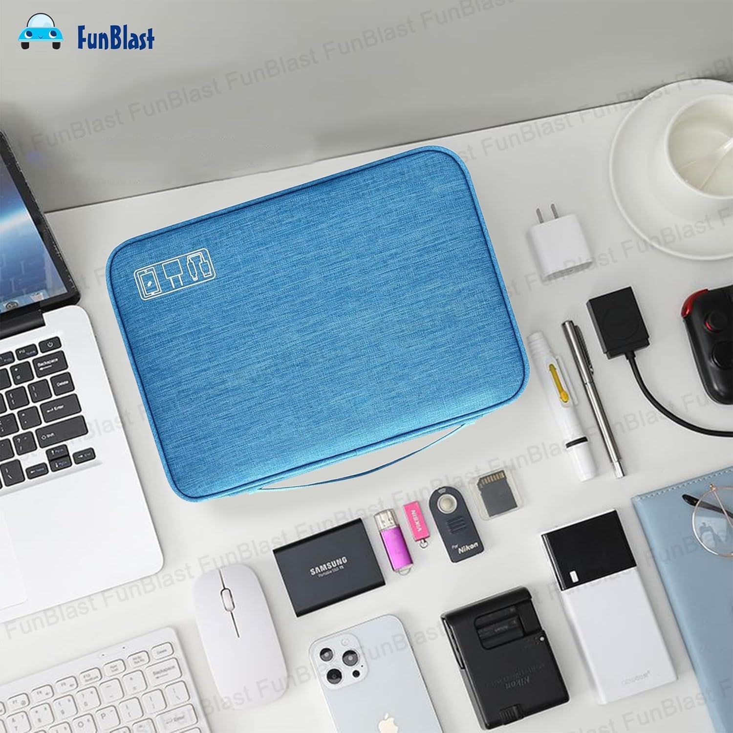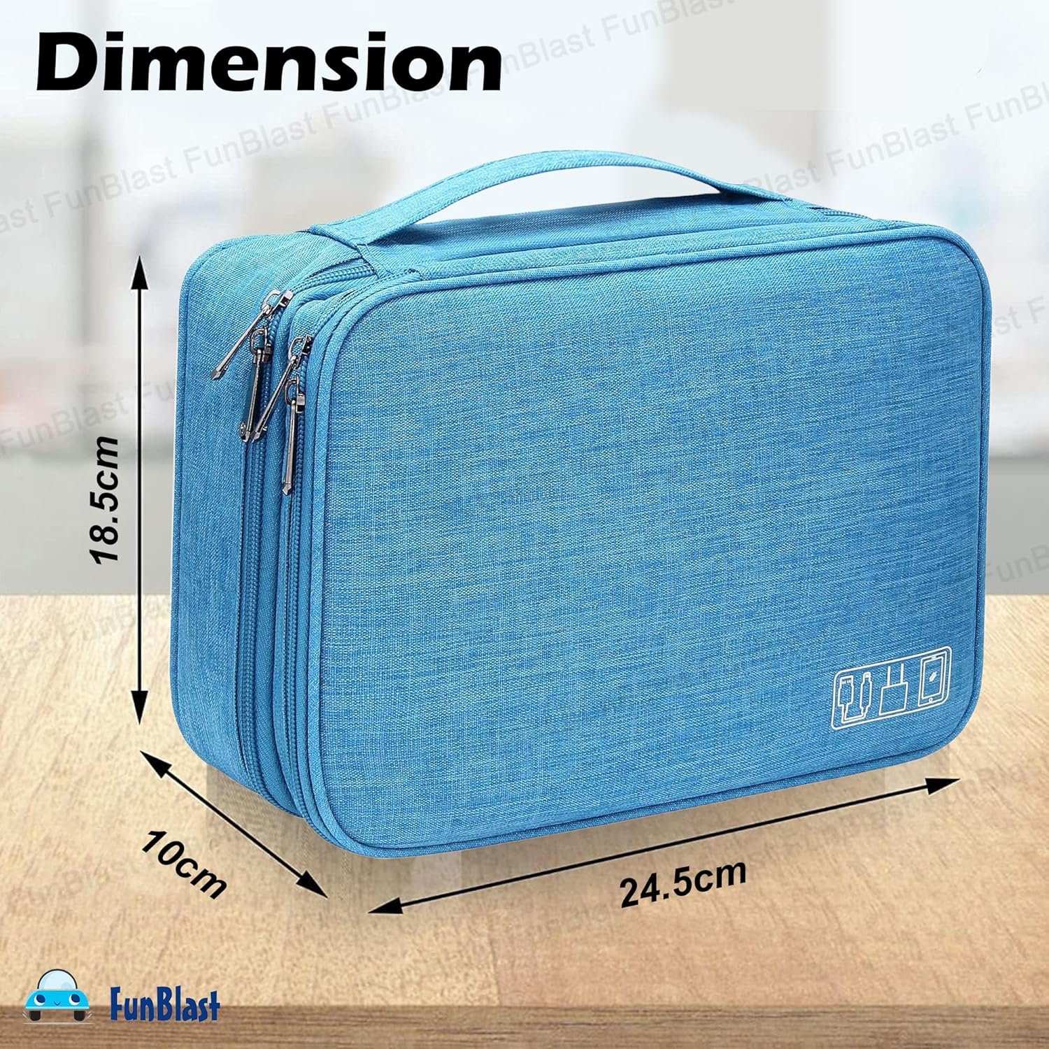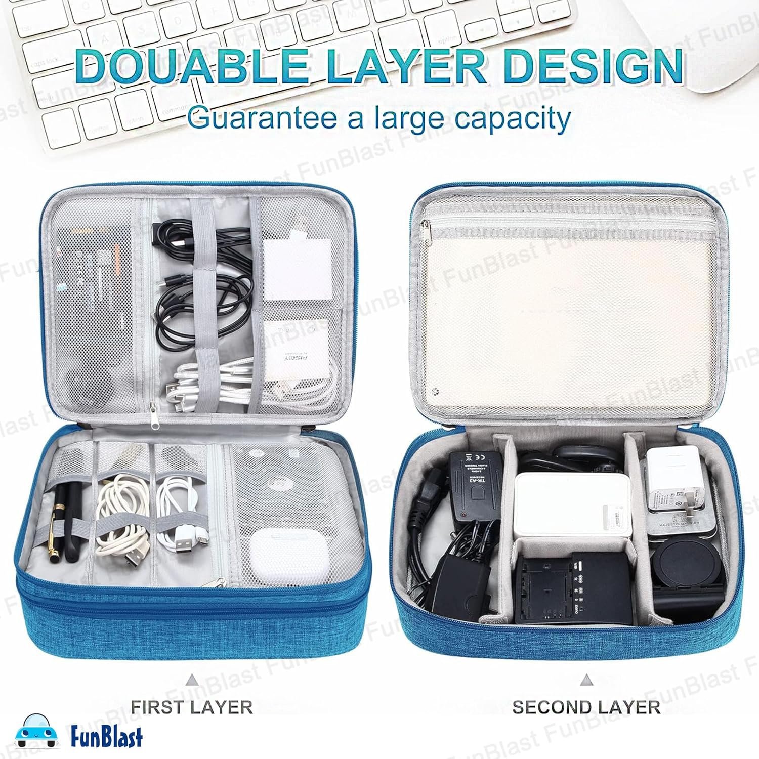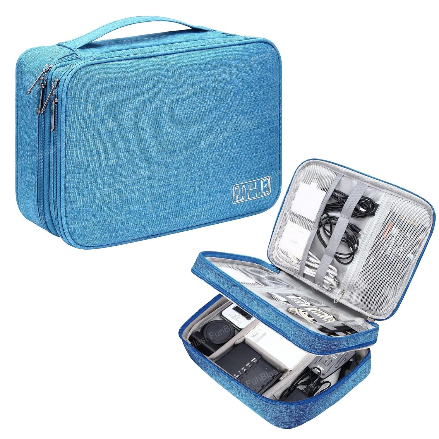 Content – 1 Pcs FunBlast Electronics Accessories Organizer Bag, Universal Carry Travel Gadget Bag, Double Layer Travel Cable Organizer Bag. Dimension: 24.5 X 18.5 X 10 CmDouble Layers & Organized -This travel electronics organizer bag is designed with two separate layers, multiple mesh pockets and various size of elastic bands providing great flexibility for organizing electronics accessories. Plenty of pockets suit for Cables, Cord, Chargers, Hard Drive, Flash Drive, SD Card, Phone. Keep all your gears easily found.Waterproof & Protected -This cable organizer bag is made of quality and durable cation fabric, the front pocket is made of PU leather & Oxford Polyester, water and scratch-resistant, Padded foam and elastic bands, protects electronics accessories from dust, shock, and moisture.DIY & Large Capacity – This travel cord organizer bag has 4 removable padded dividers to protect items inside from scratches, impact and accidental falling. You can design the layout as you wish to keep all your electronic travel accessories in perfect order.Convenient & Portable – The electronics travel organizer is perfect for Business, Traveling, School, Camping, Home. Its perfect size allows it to be easily put into your backpack and luggage. This cord organizer will be a perfect helper while you are on travel or business trip.