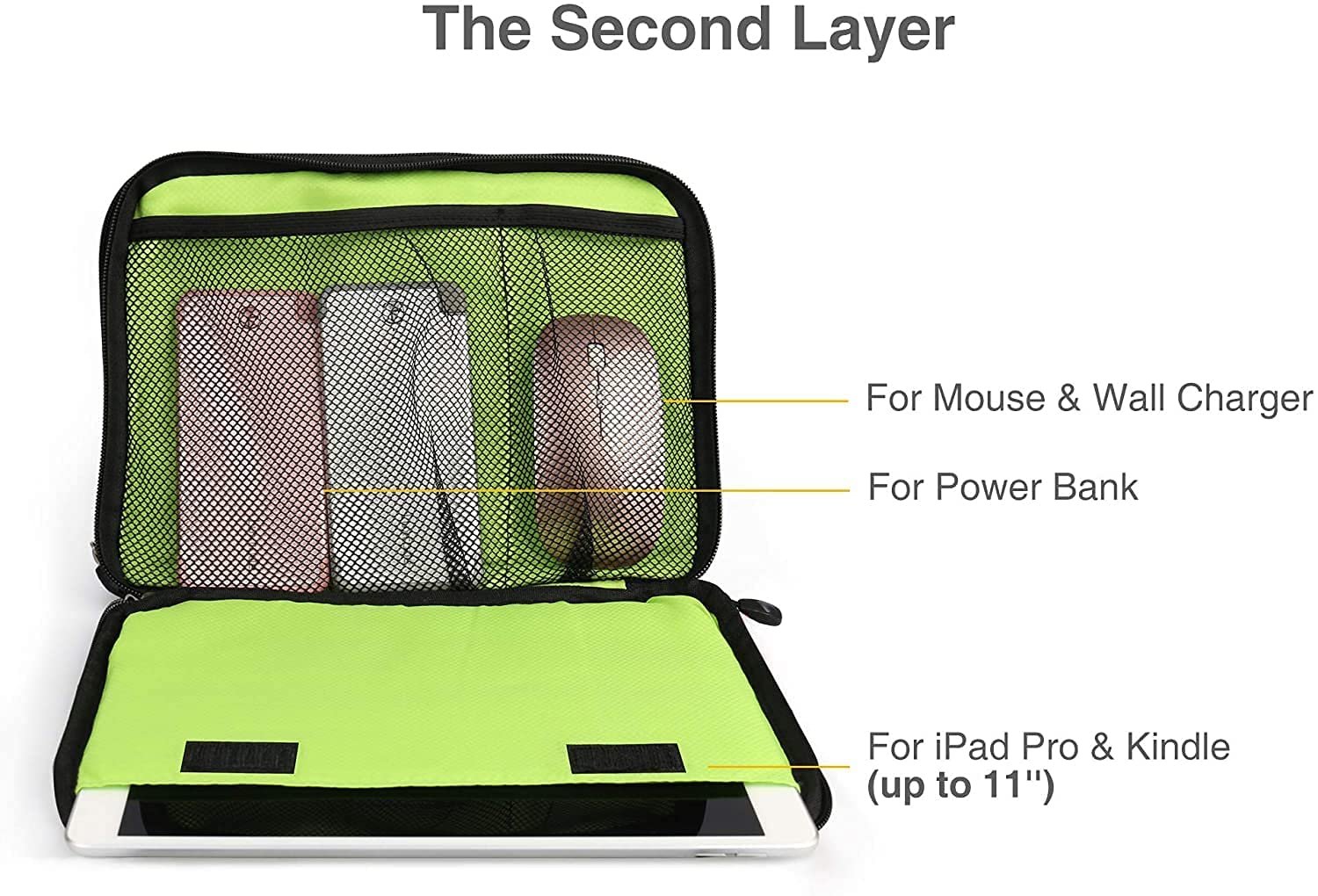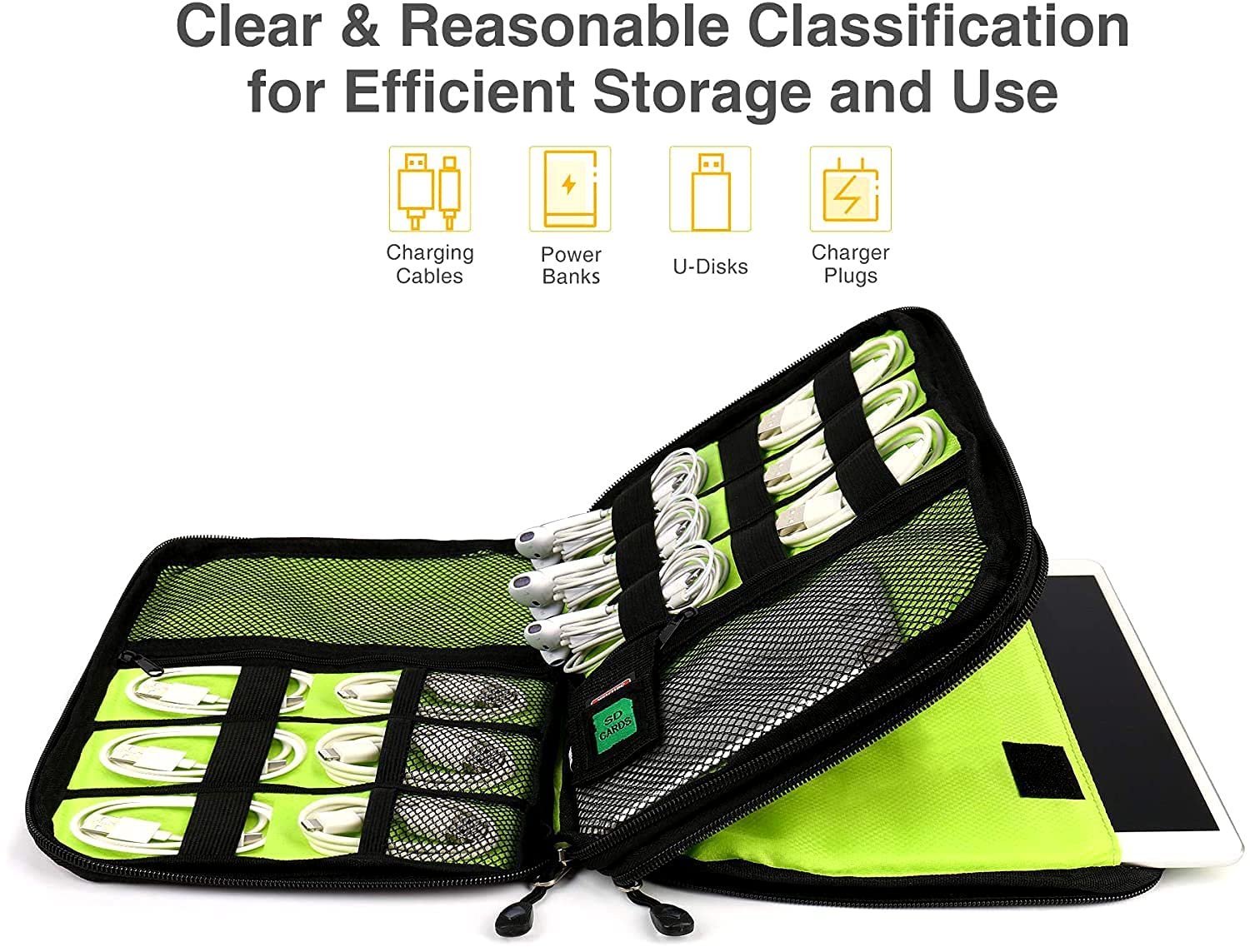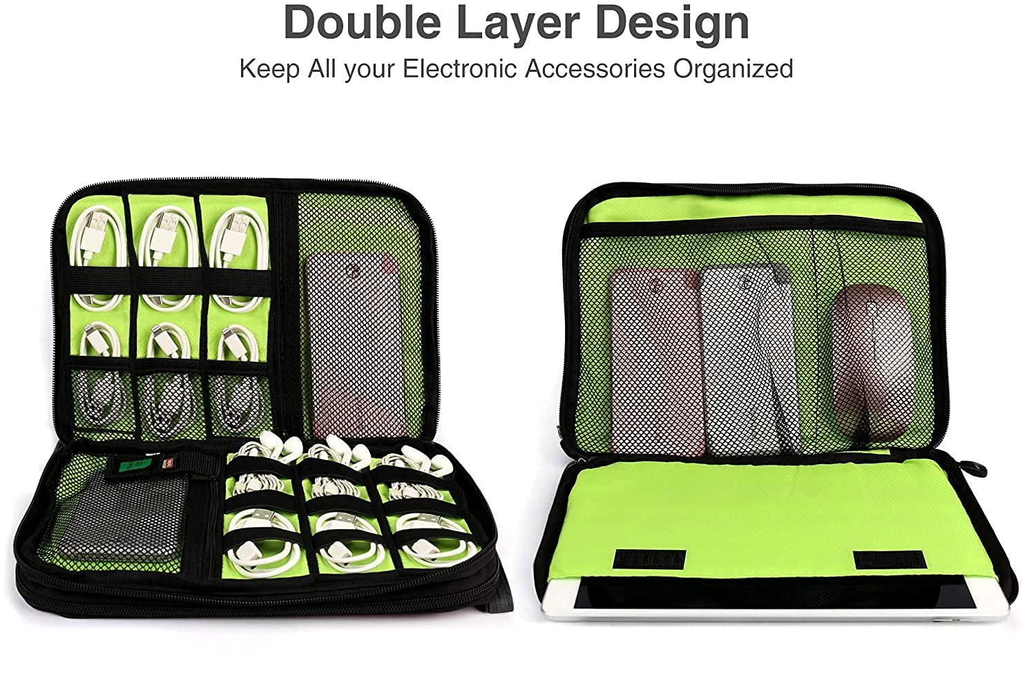 Business Trip and Daily Use Keep everything in reach, great electronic organizer bag for a business trip and daily use. Large Capacity & Multi-function Travel organizer bag with a double layer to organize your electronic devices such as mini iPad, cables, charger, power bank, you will never worry about the mess. Secure Storage-Outside Dual Zippers Outside dual zipper ensures that all products are safe in the travel cable organizer bag. The First Layer The first layer of this travel cable organizer bag can store your cables, wall chargers, power bank, and SD card, etc, keep all your electronic accessories organized. The Second Layer The second layer of this electronics organizer bag can store your mini iPad, kindle, mouse, etc. Clear&Reasonable classification for efficient storage and use. Separate Dedicated SD Card Slot 1 x SD card slot inside this cord organizer bag to prevent SD card missing in traveling. Specifications: