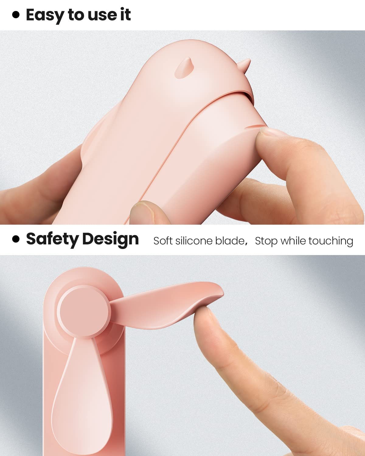 【Safty Handheld Fan】If you accidentally touch the rotating blades, the blades with special soft TPE material will automatically stop. The fan blades can be folded up for easy carrying and storage when the fan is not in use.
