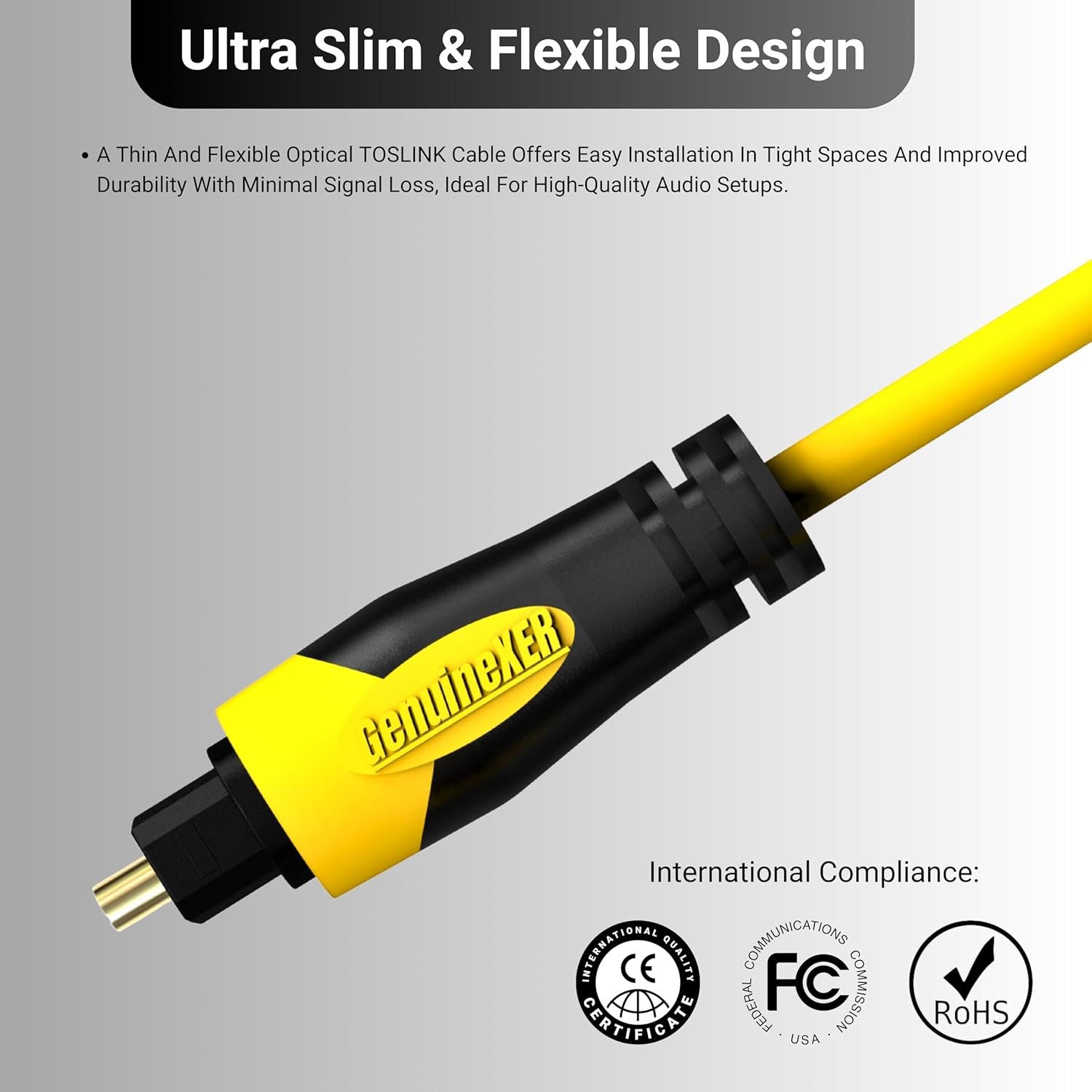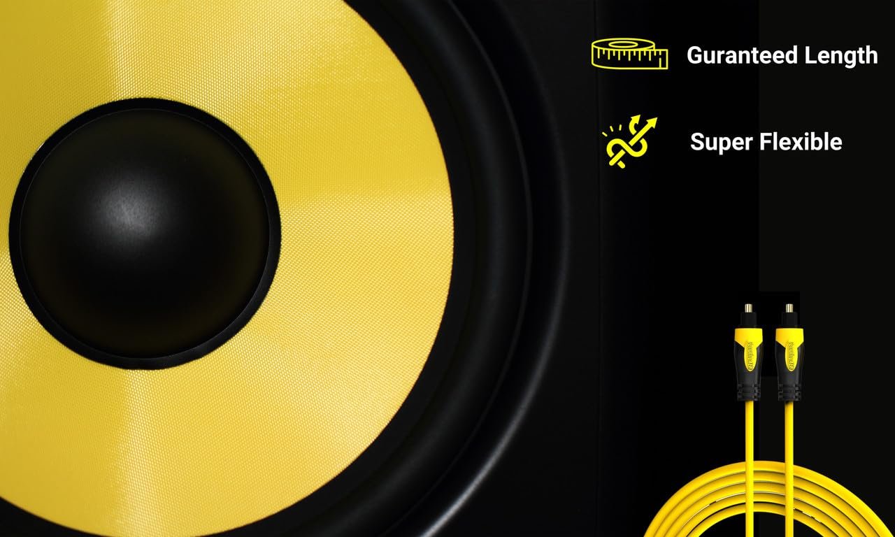 Brand GenuineXER Cable Type Toslink Optical Cable Available Length 1M-15M Base Material Optical Fiber Core Connecter Material Copper Connecter Plating Material 24K Gold Jaacket Colour Yellow Jacket Material PVC Compatible With Sound Bar, Home Theatre, Speakers, Audio Player, XBox, PlayStation, DVD Player, Amplifier, Audio Mixer