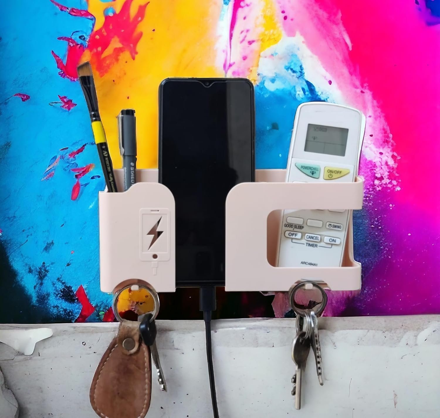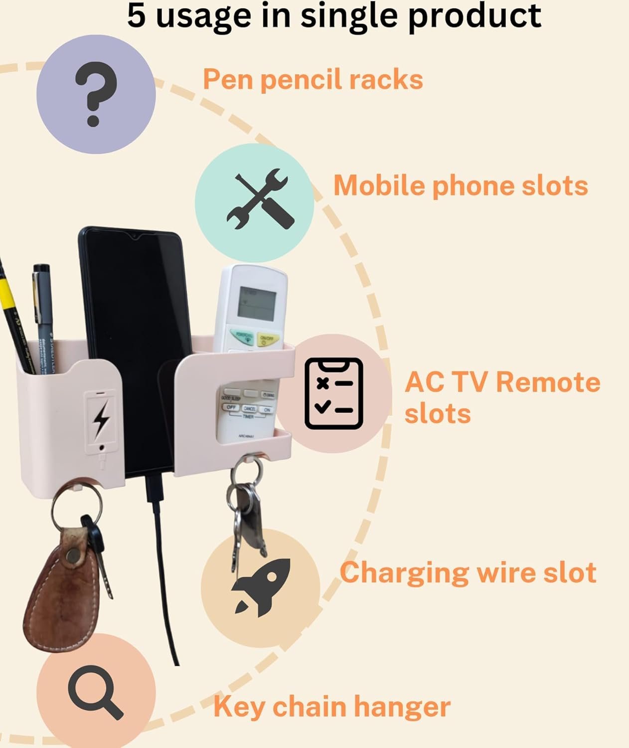 Mobile phone charging standTV or AC remote control slotsPen Pencil storage rackCharger wire holding options.Key chain hangers