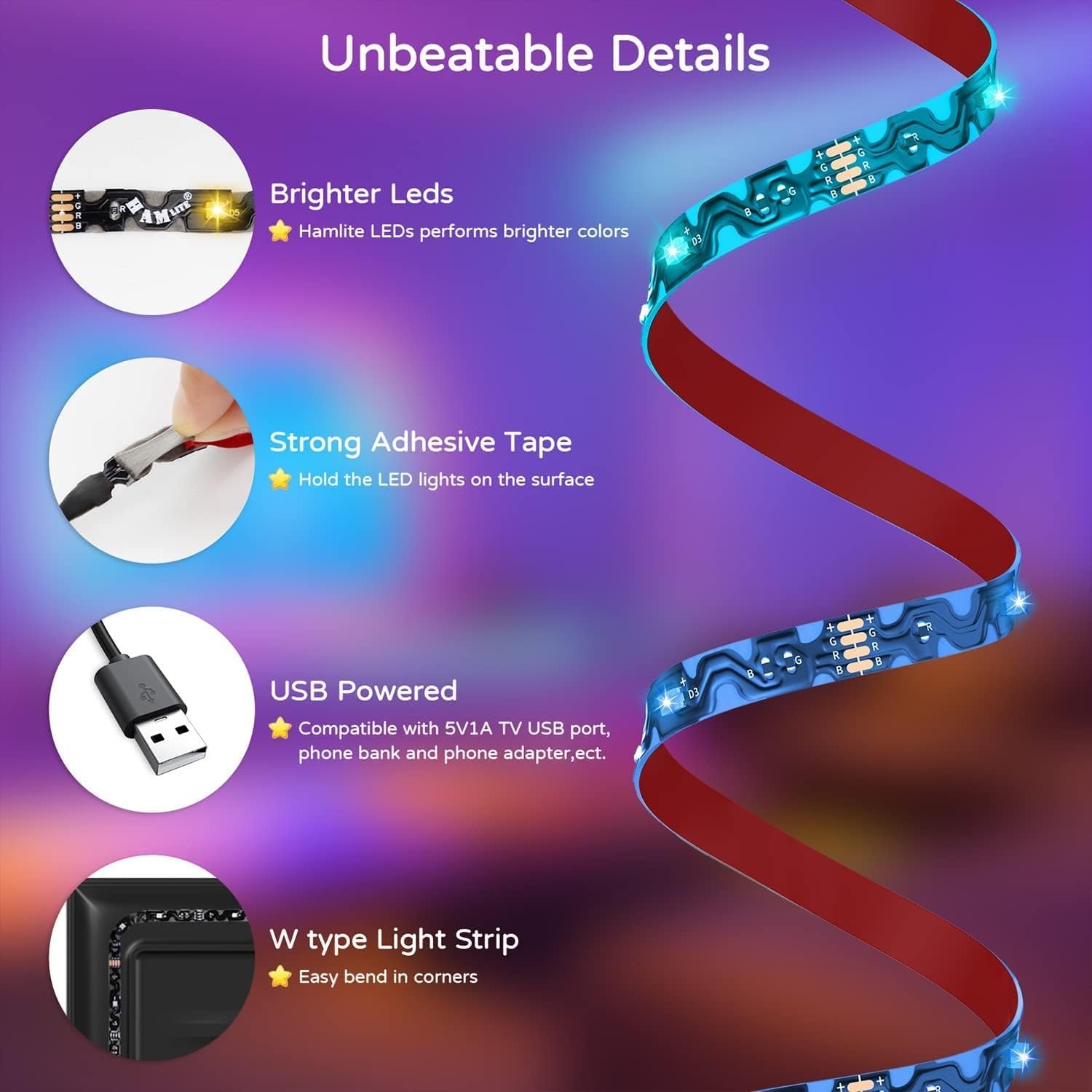Ambient Backlighting for TV Our TV strip lights provide a good viewing experience in the dark and relieve the visual fatigue caused by the dim environment. With millions color, offering you an immersive TV viewing experience. Help create a home theater, takes your life to a different level. Behind TV lights built-in high-sensitivity microphone, will automatically change according to beats. Create the best atmosphere when you listening soothing music, rock Music, or watching movie.