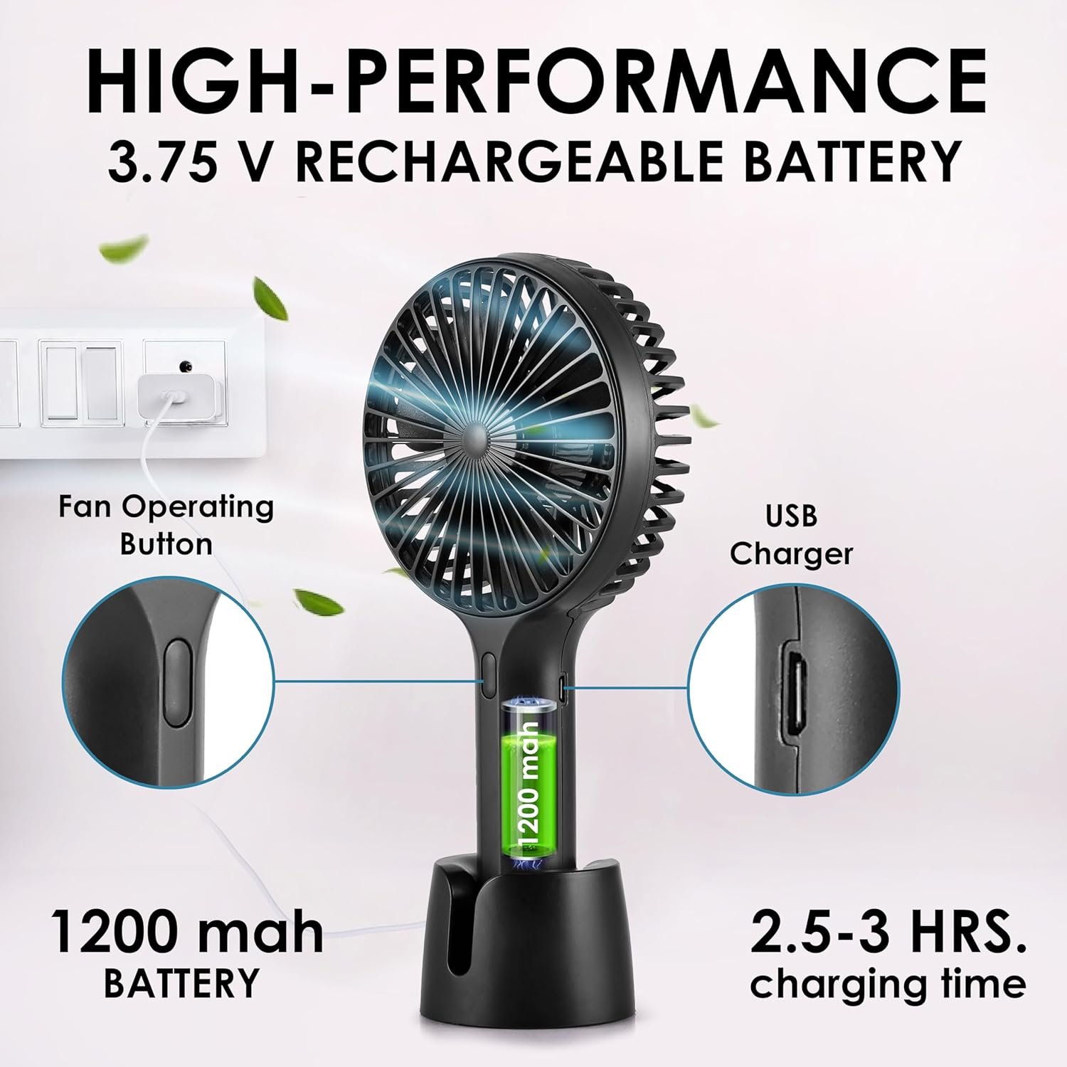 Gesto Mini Portable Usb Hand Fan or DC Fan – 3 Speed Modes Handheld Fan for Summer With 1200 mAh Battery| Rechargable Hand fan for Women| Portable Fan for Makeup,Kitchen, Indoor,Outdoor,Travel (Black)