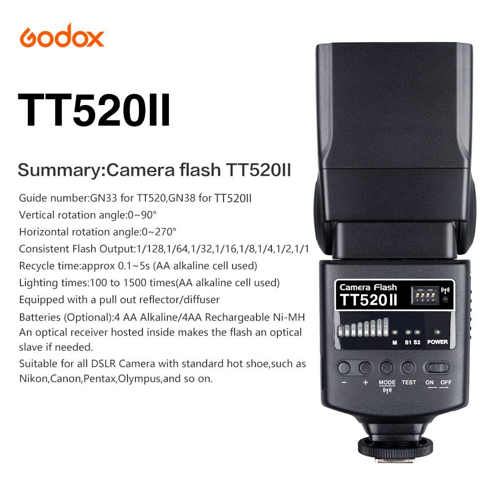 Whether you shoot with Canon, Nikon, Pentax, Olympus, Fuji, or other DSLR cameras, the Godox TT520ii is designed to seamlessly integrate with your gear. Its universal compatibility makes it a valuable addition to any photographer’s toolkit.
