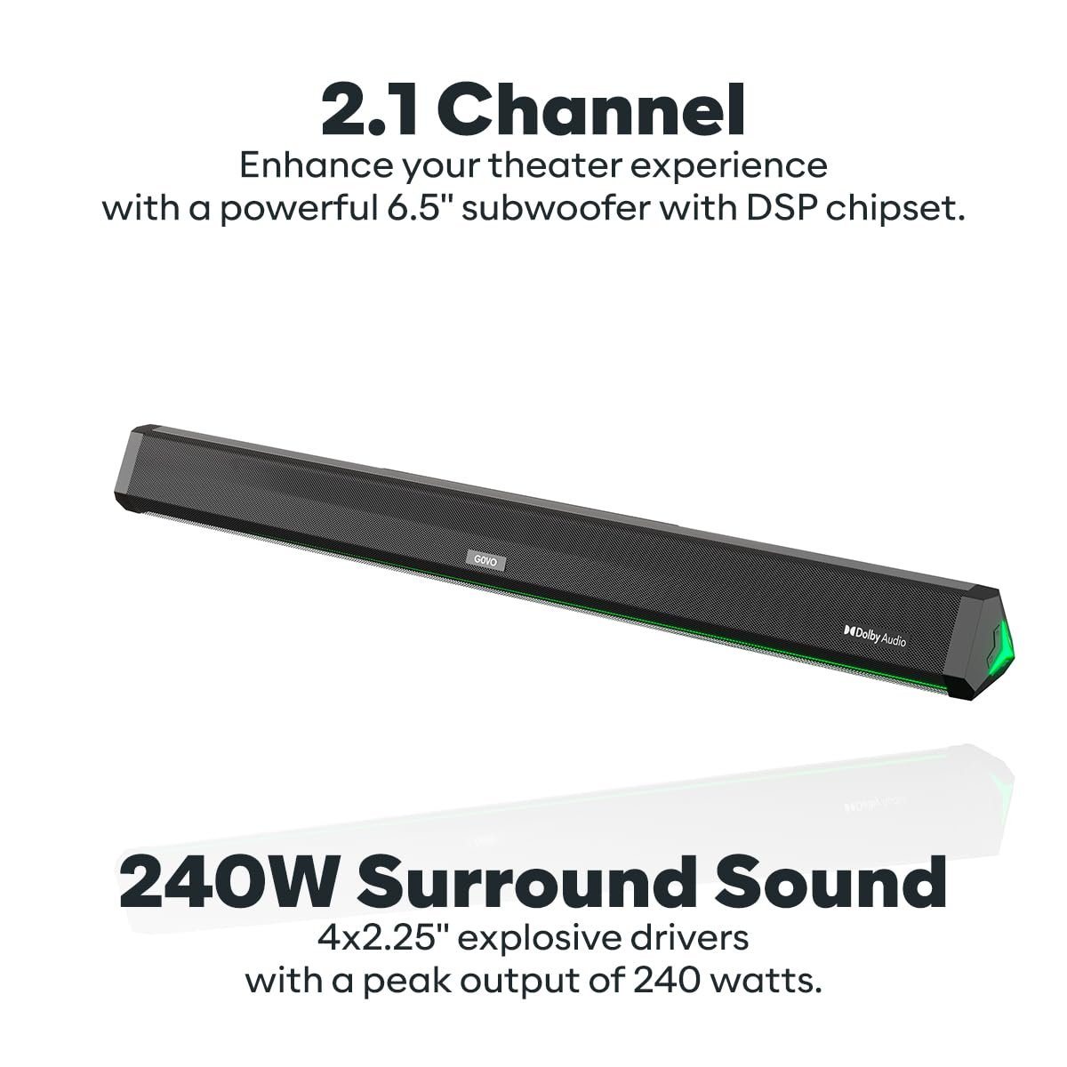2.1 Channel: 4 x 2.25″ speakers with 240 Watt peak output 3D Surround Sound, DSP EnabledSubwoofer: Enjoy your theater experience with the deep bass of the 6.5″ subwoofer