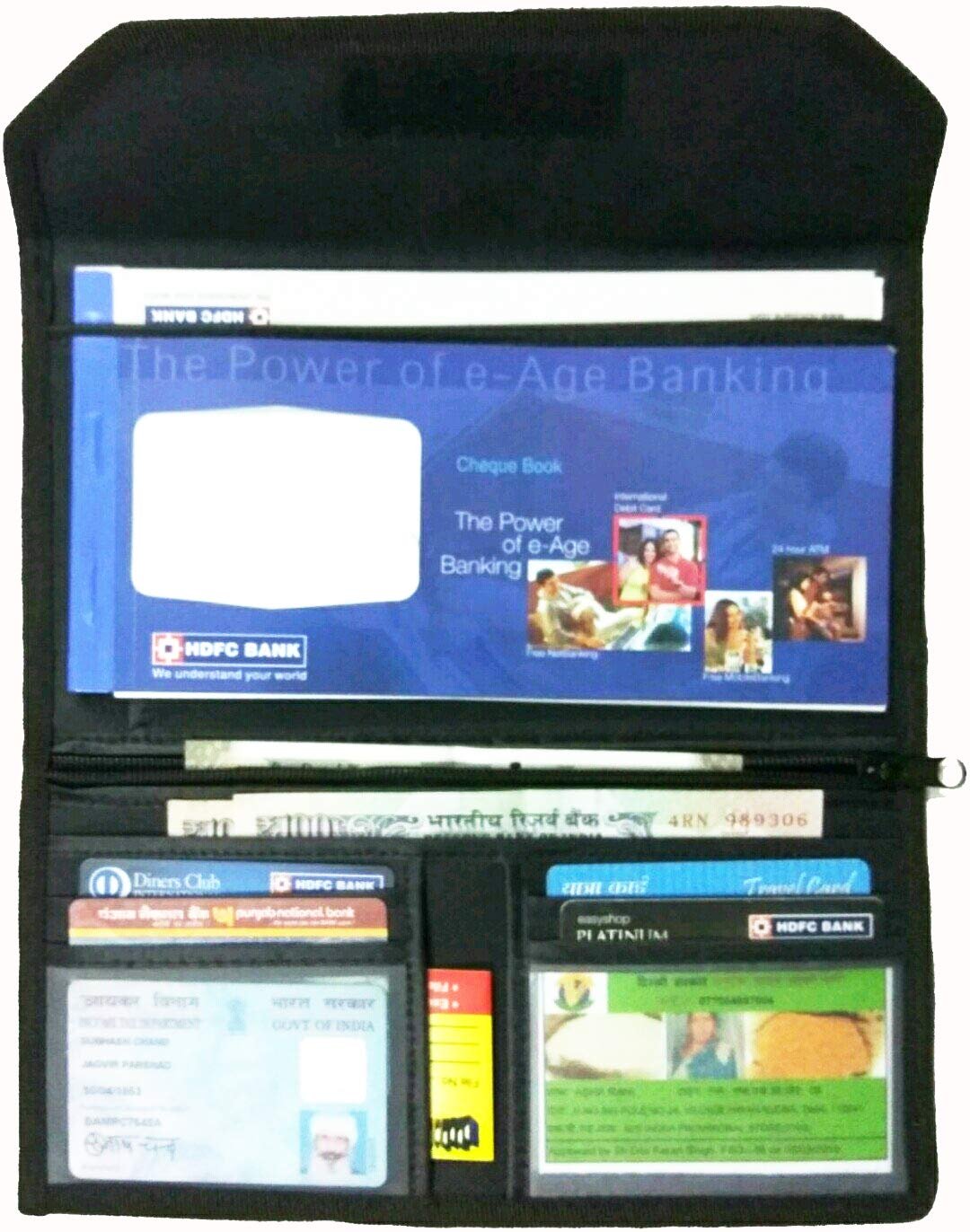 BRAND : GreatDio Product Type :Cheque Book Holder Product Color :Black Product Dimension :38cm x 27cm Product Description: This Cheque Book is elegant and is the perfect travel companion. Carry this cheque book wherever you go and look classy. With right number of slots this cheque book will allow you to carry all your important documents such as cheque book, cards and other travel document. This is elegant multi pocket leather cheque book holder with strong closure. The size of this folder when closed is 25cm x 12cm. Exceptional design and attractive Interior design with multi credit card / business card slots. Inner Structure: 1. 2 transparent compartments to keep the id cards, ATM card, credit card 2. 2 Compartments to keep to keep ATM card, credit card, coin & money 3. 1 Compartment to keep your driving License or money 4. 1 Zipper Compartment to keep you’re your important documents & money 5. 1 Compartment to keep your mobile. 6. 1 Large compartment to keep your chequebook, passbook & pass port.